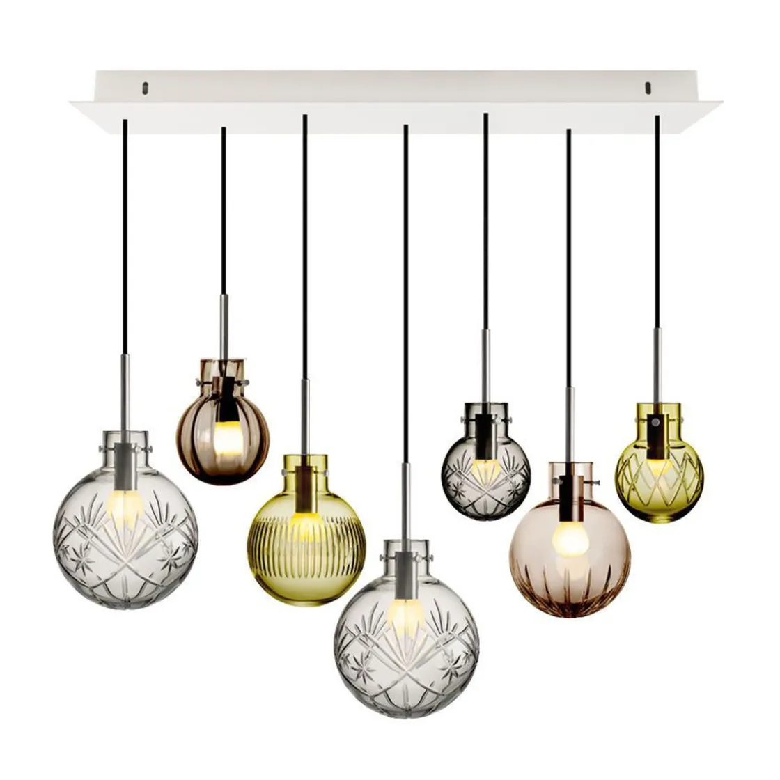 I denne kombinasjonen medfølger følgende krystallkuler: Krystallkulene 2xFinn Klar 200 mm, Finn Røkgrå 120 mm, Optikk Kakao 120 mm, Skjær Oliven 160 mm, Stor Stjerne Kakao 160 mm og Kryss Oliven 120 mm. Ståloppheng til 7 Krystallkuler med sort tekstiltrukket kabel på 3 meter. 1 meter lang hvit rektangulær takbaldakin