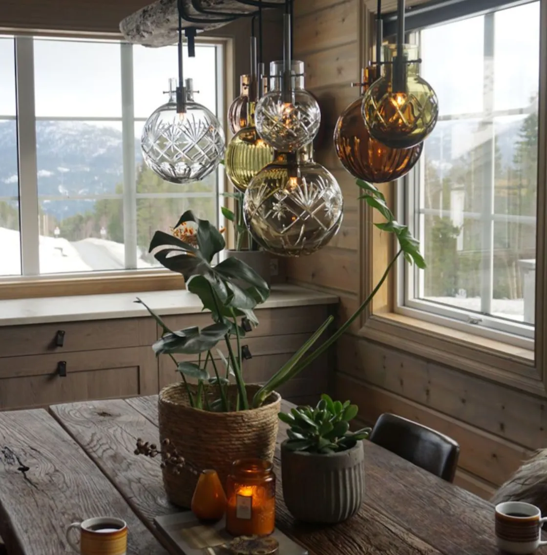 Interiørstylisten Renate Larsen Lorentzen har valgt den perfekte kombinasjonen av krystallkuler til nettopp sin hytte. Hun har gått for 7 kuler i de klassiske slipmønstrene Finn, Skjær, Stor Stjerne, Kryss og Optikk i fargene klar, kakao og oliven. Nå kan du også få den lekre stilen til Renate med hennes selvkomponerte krystallkulelampe Rav.