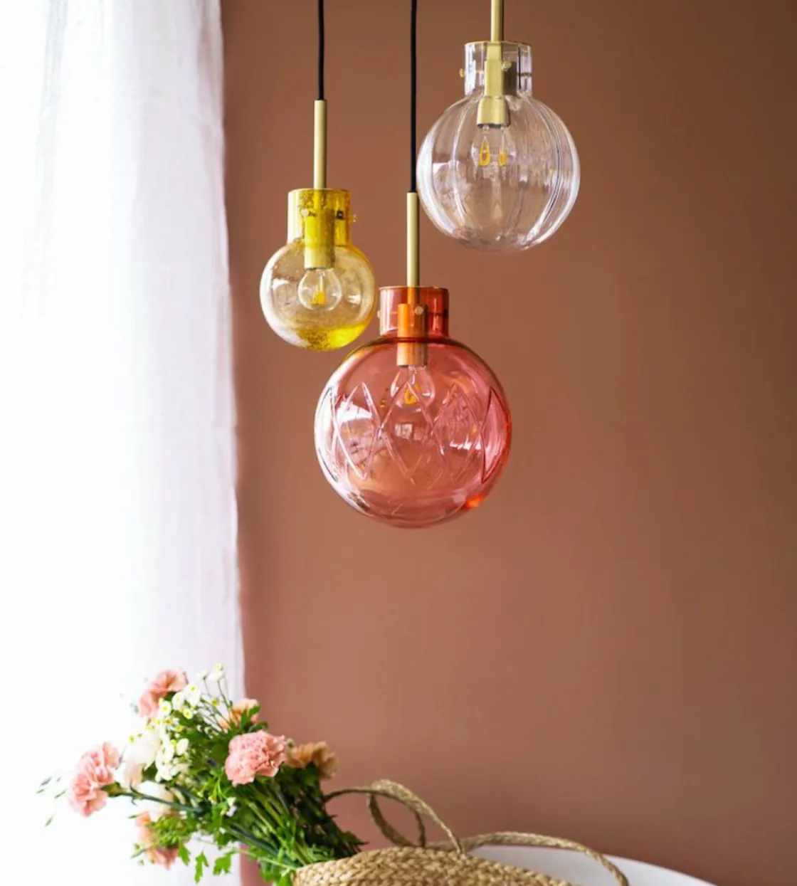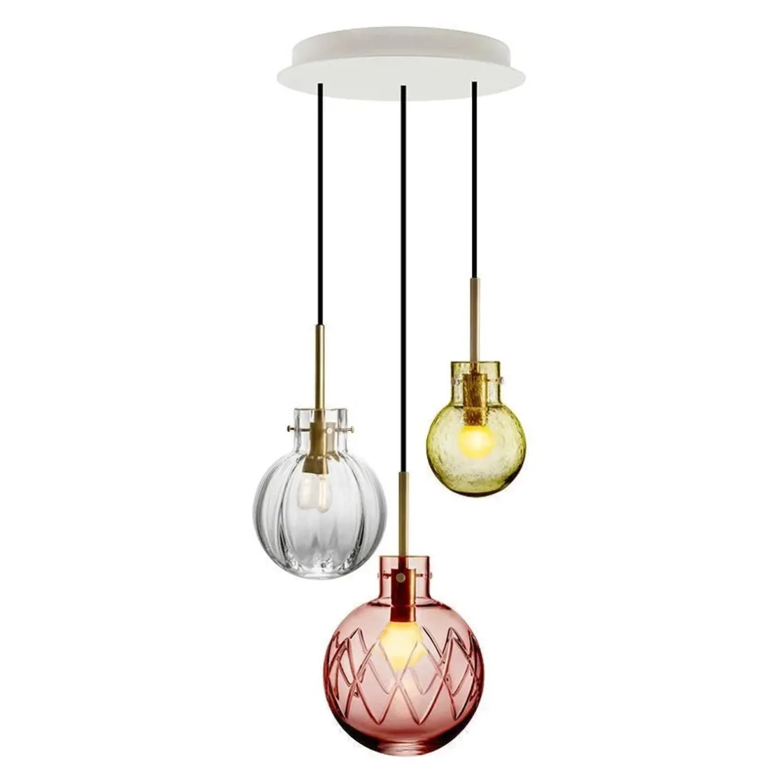 I denne kombinasjonen er det brukt følgende krystallkuler: Kryss morgenrød 200 mm, optikk klar 160 mm og soda varmgul 120 mm. Messingoppheng til 3 krystallkuler med sort tekstiltrukket kabel på 3 meter. Sort rund takbaldakin 34cm.