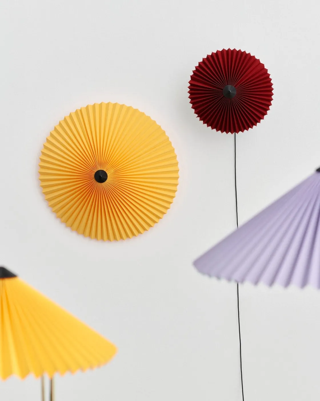 Matin Tak og Vegg-lampe har et moderne men poetisk design, med en konstruksjon som kombinerer visuell delikatesse med fysisk robusthet. Den takmonterte modellen består av et lakkert stålbeslag for montering på veggen eller i taket, kombinert med en plissert stoffskjerm. Skjermen er tilgjengelig i to størrelser og flere fine farger.