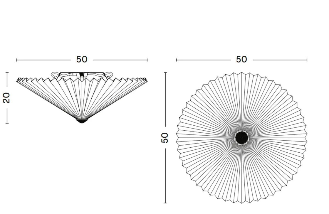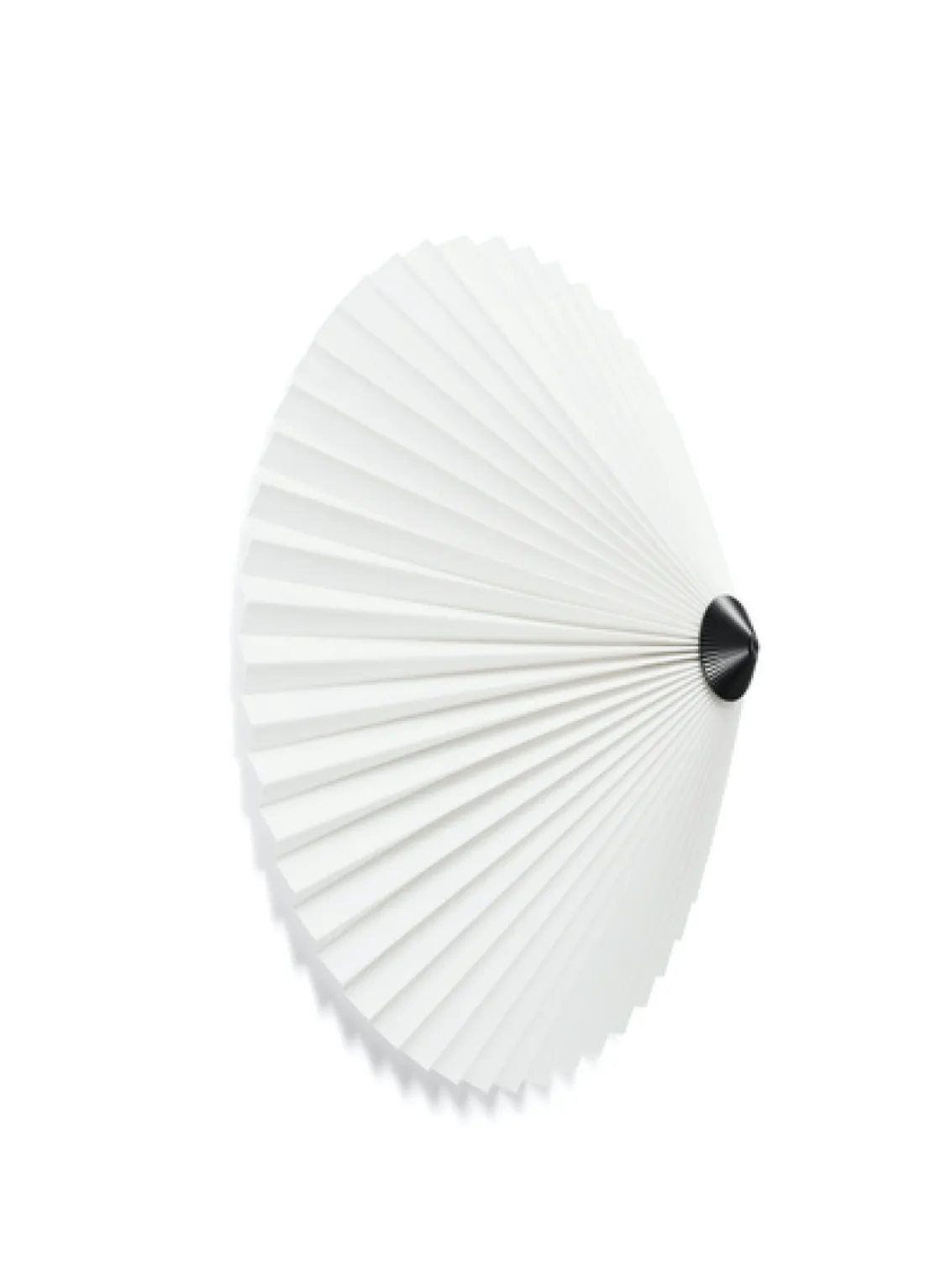 Matin Tak og Vegg-lampe har et moderne men poetisk design, med en konstruksjon som kombinerer visuell delikatesse med fysisk robusthet. Den takmonterte modellen består av et lakkert stålbeslag for montering på veggen eller i taket, kombinert med en plissert stoffskjerm. Skjermen er tilgjengelig i to størrelser og flere fine farger.