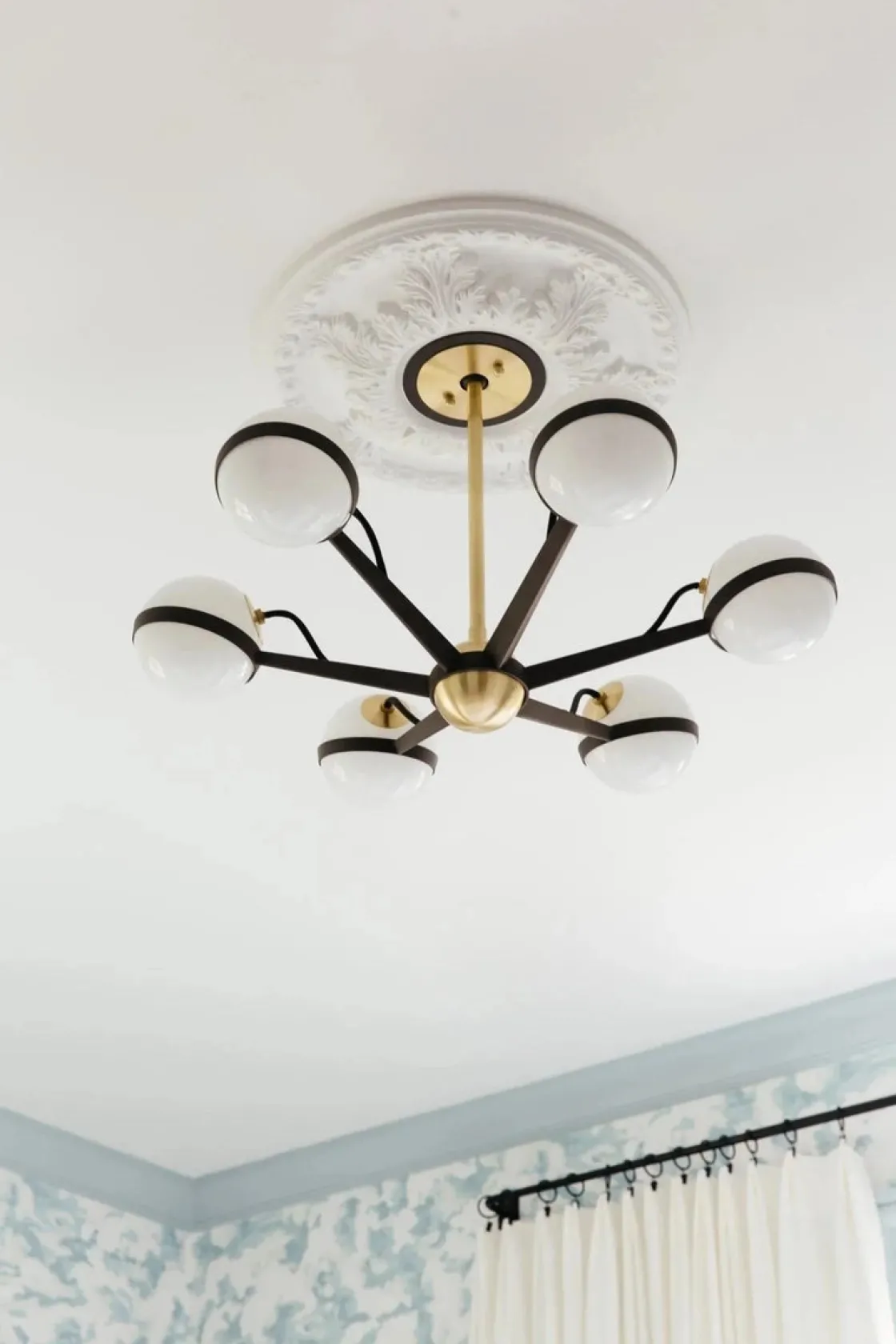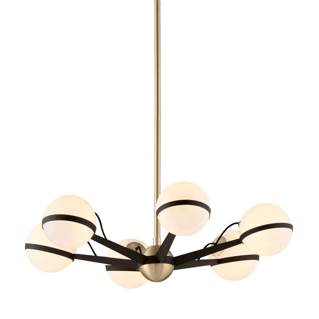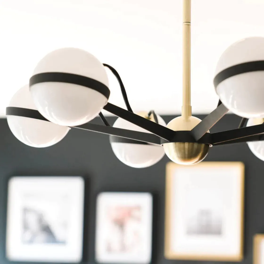 Ace er en moderne og sofistikert lysekrone som løfter ethvert rom. Heng den over et bord eller midt i rommet om høyden tillater det. Lampens høyde kan reguleres fra min 43cm – max 134cm fra taket. Lampen har 6 kupler i opalhvitt glass og sørger for godt lys til rommet.