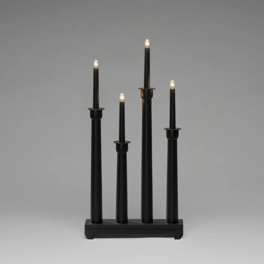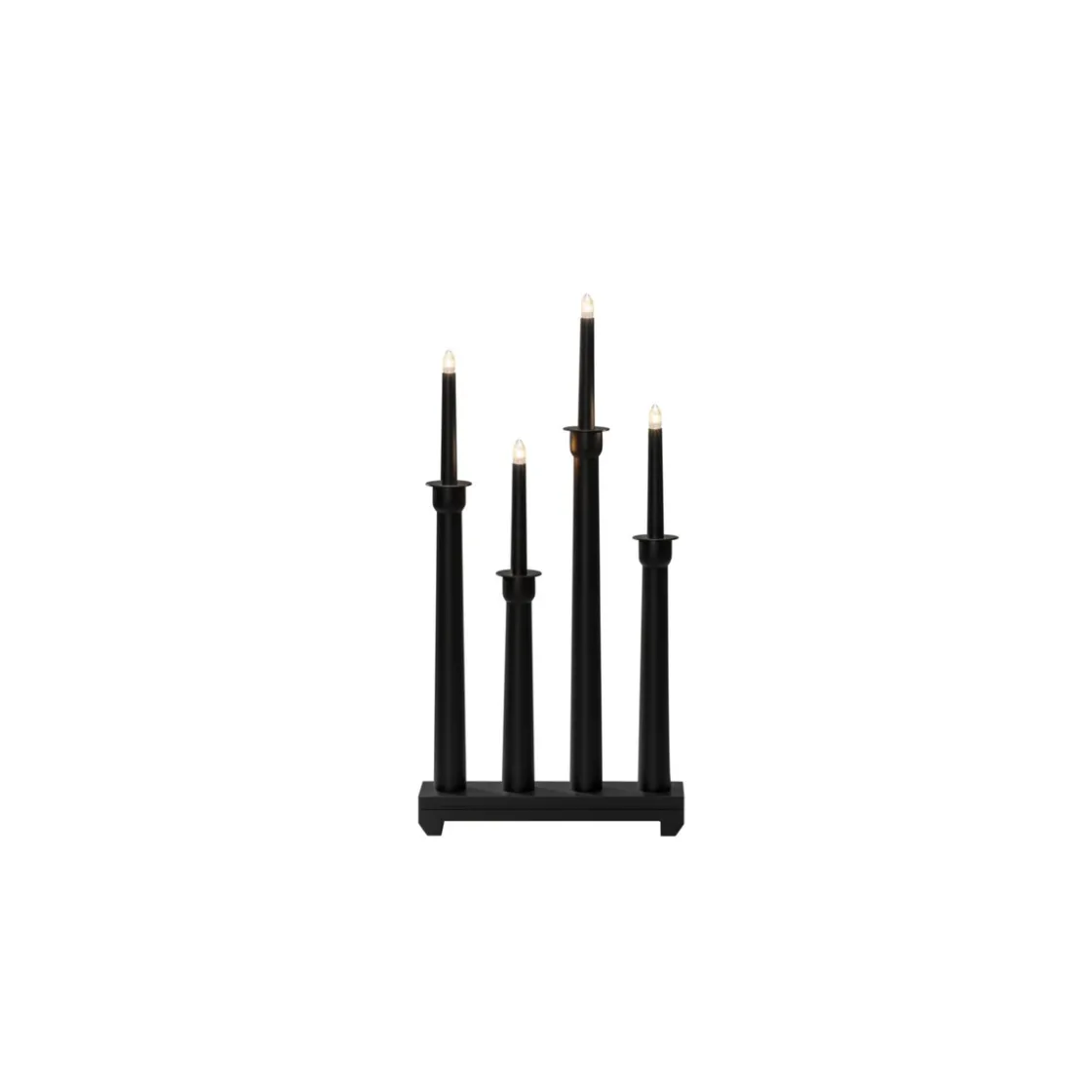 Adventstake 4 armet i sortlakkert tre. Sorte dekorasjons ringer.