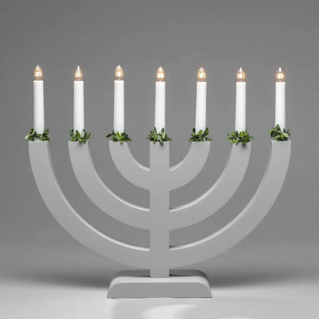 Hvit adventsstake med 5 armer og grønne mansjetter.