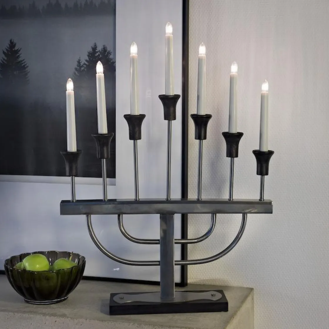 Stor adventsstake i ubehandlet metall. Rå aluminium kombinert med svart gir den et ekstra tøft uttrykk. Adventsstaken har slank fot, så selv om den er stor kan den fin plasseres i slank vinduskarm.