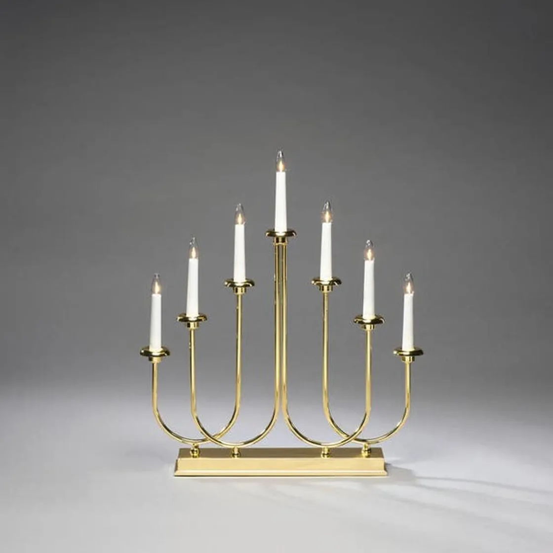 Adventstake 7 armet i messingbelagt metall. Adventstaken har klare pærer og den er utstyrt med inebygget dimmer slik at du selv kan bestemme ønsket lysstyrke.