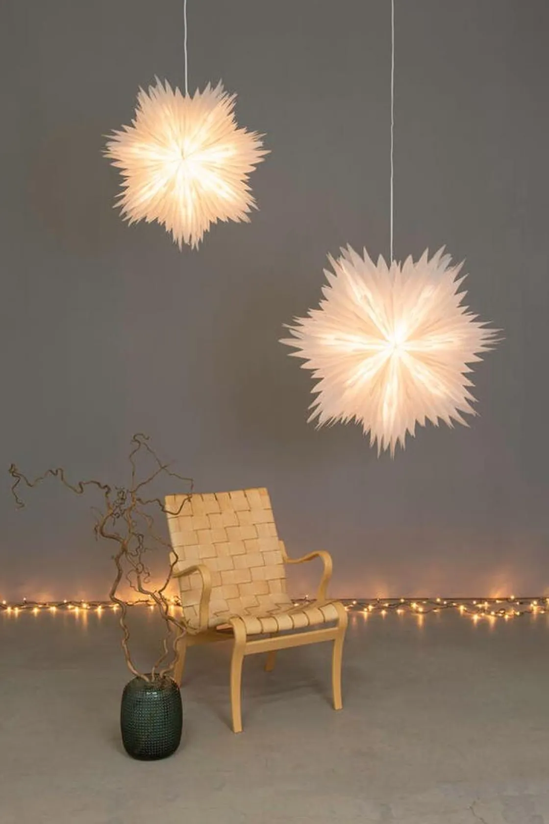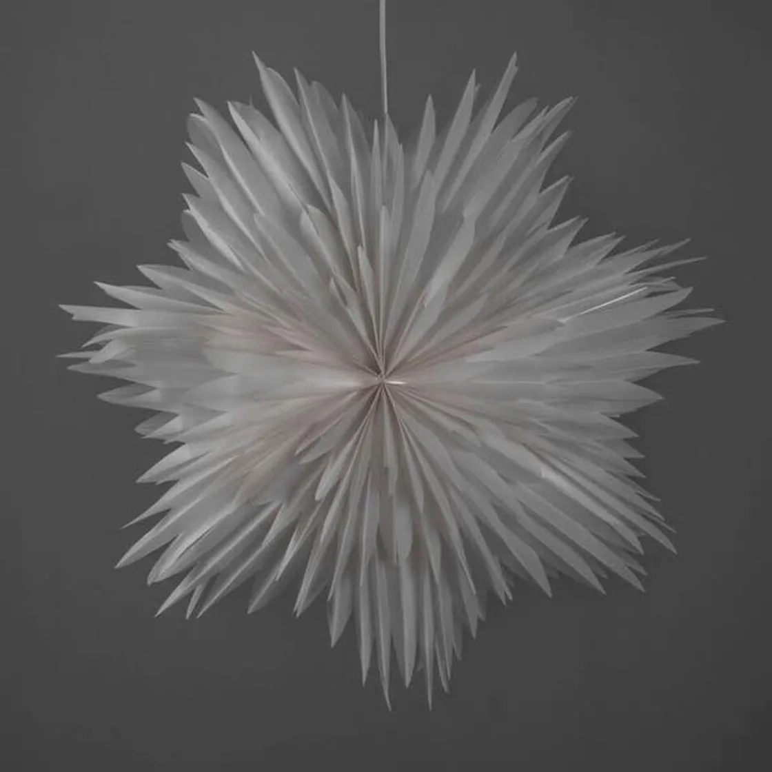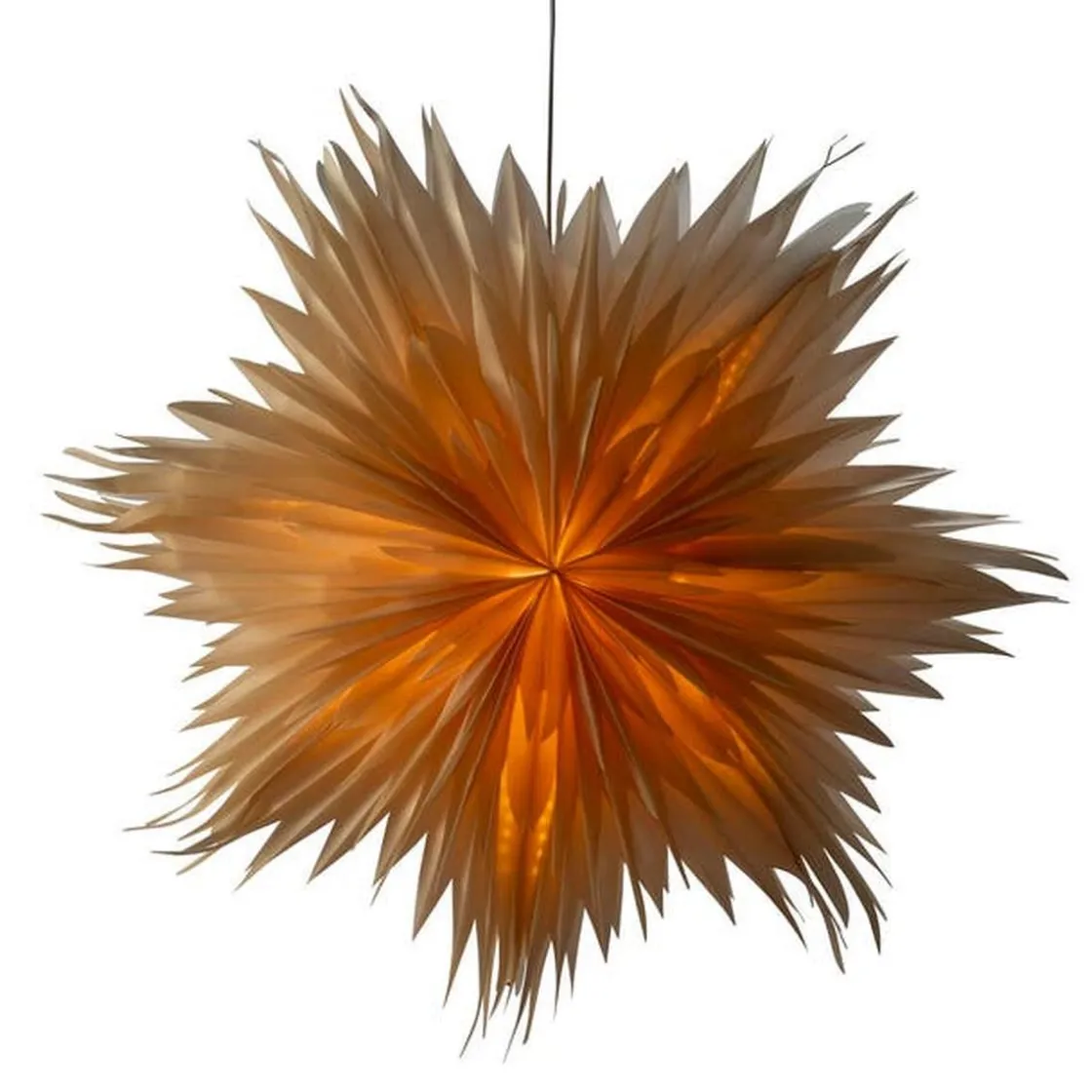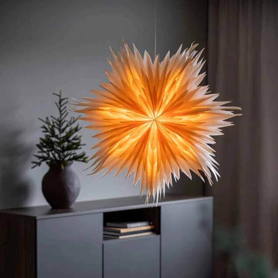 Imponerende adventsstjerne i gyllent papir med elegant perlemoreffekt. Med praktisk snorhenger og hvit snor med bryter – en tidløs klassiker som skaper en varm, koselig og hjemmekoselig julestemning.