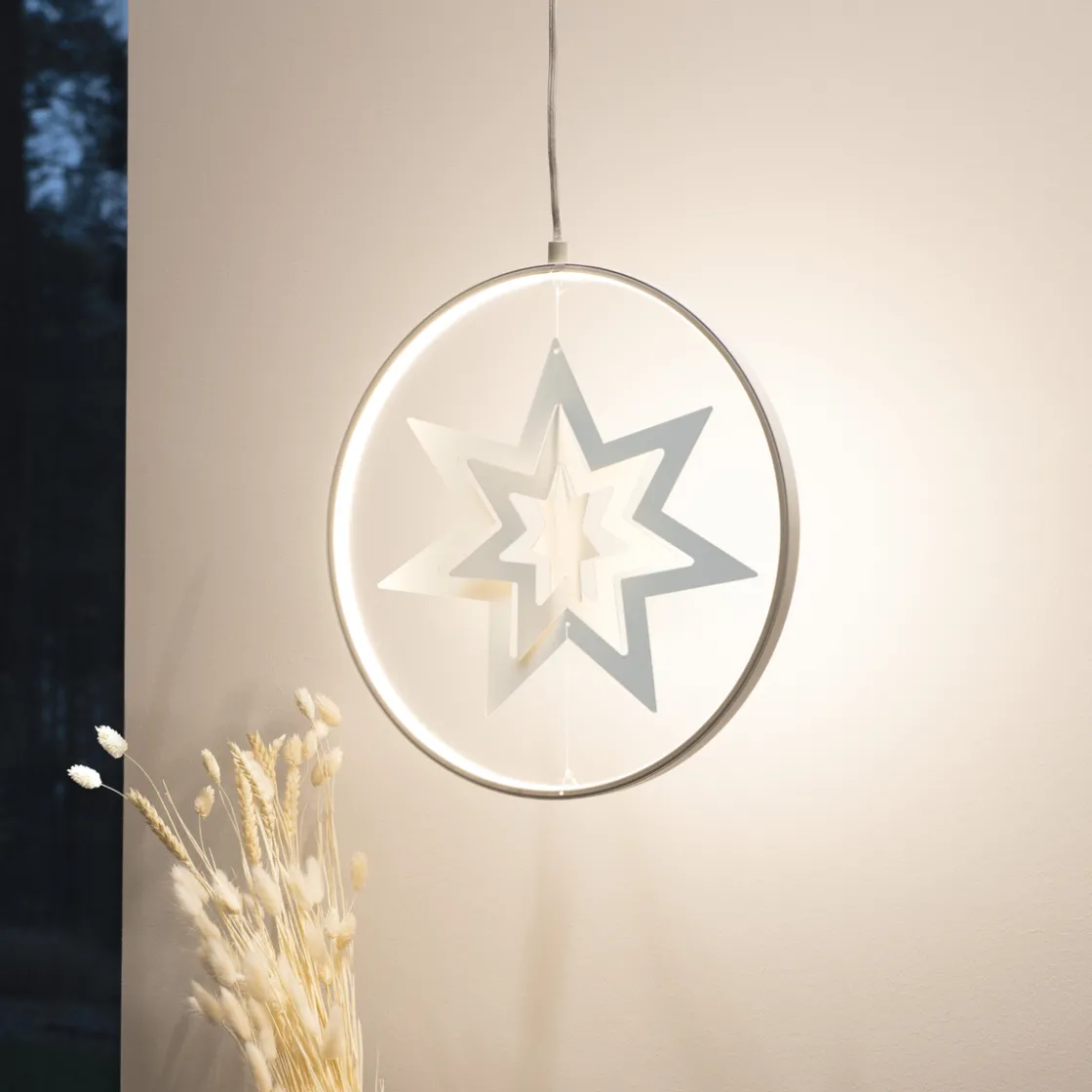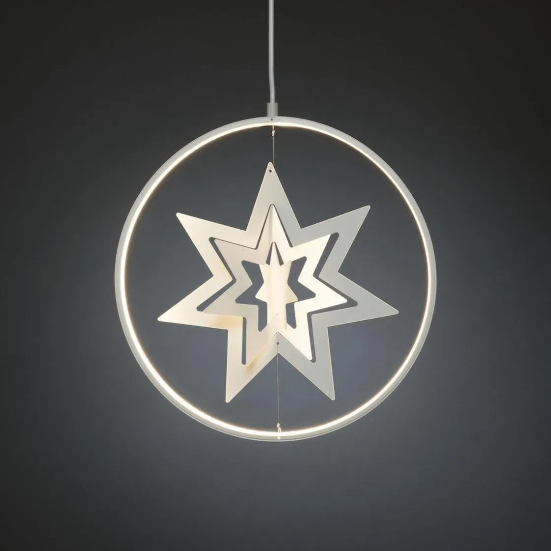 Dekorasjonsring med stjerne i hvitlakkert metall. 132 varmhvite LED. Hvit tekstilkabel og trafoen har innebygget dimmer.