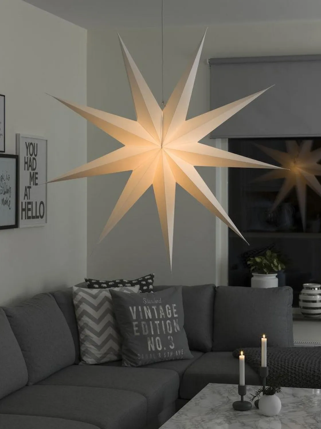 Pappstjerne 115 cm hvit, 9 armet. Inkludert oppheng. E14 lampeholder. Hvit kabel.