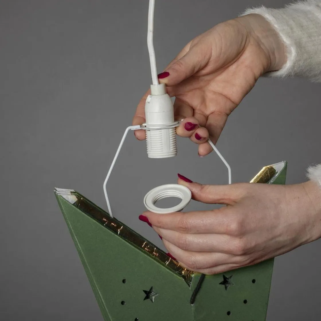 Pappstjerne 60 cm grønn fløyel med gull innside. 7 armet. Inkludert oppheng. E14 lampeholder. Hvit kabel.