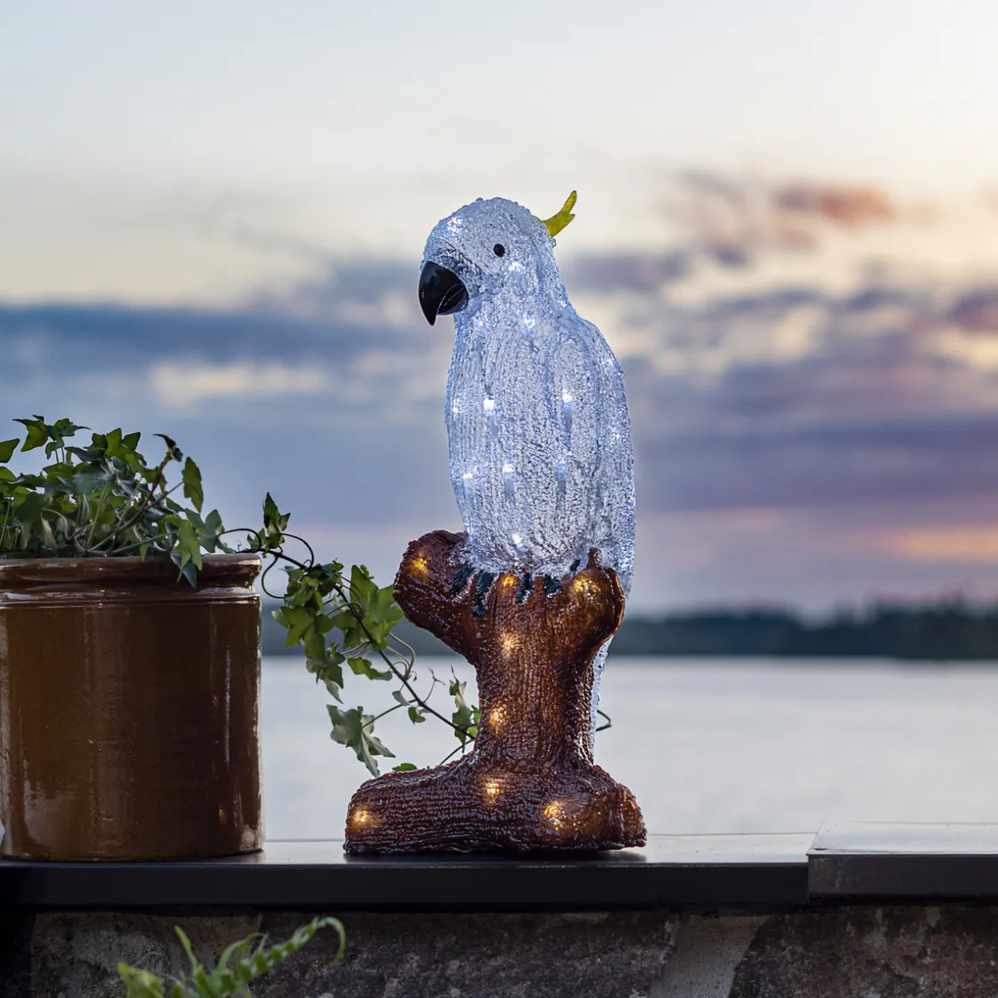Papegøye med 48 hvite LED-lys, egnet til utendørsbruk. Transformator medfølger.