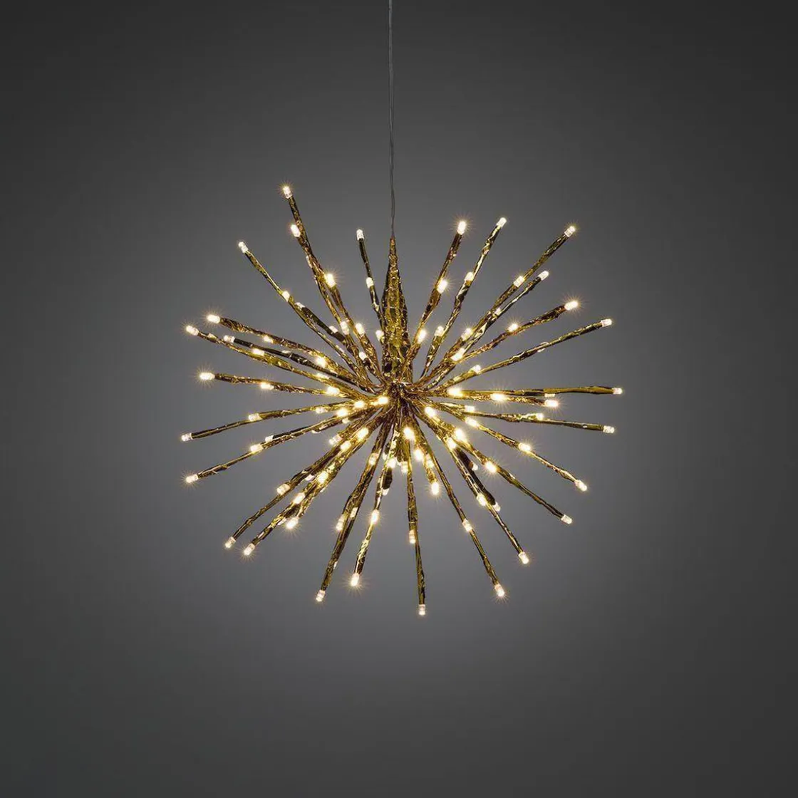 Stor lysball i gull med 120 varmhvite LED. Ballen er 40 cm i diameter. Ballen kommer flatpakket og foldes ut til bruk.