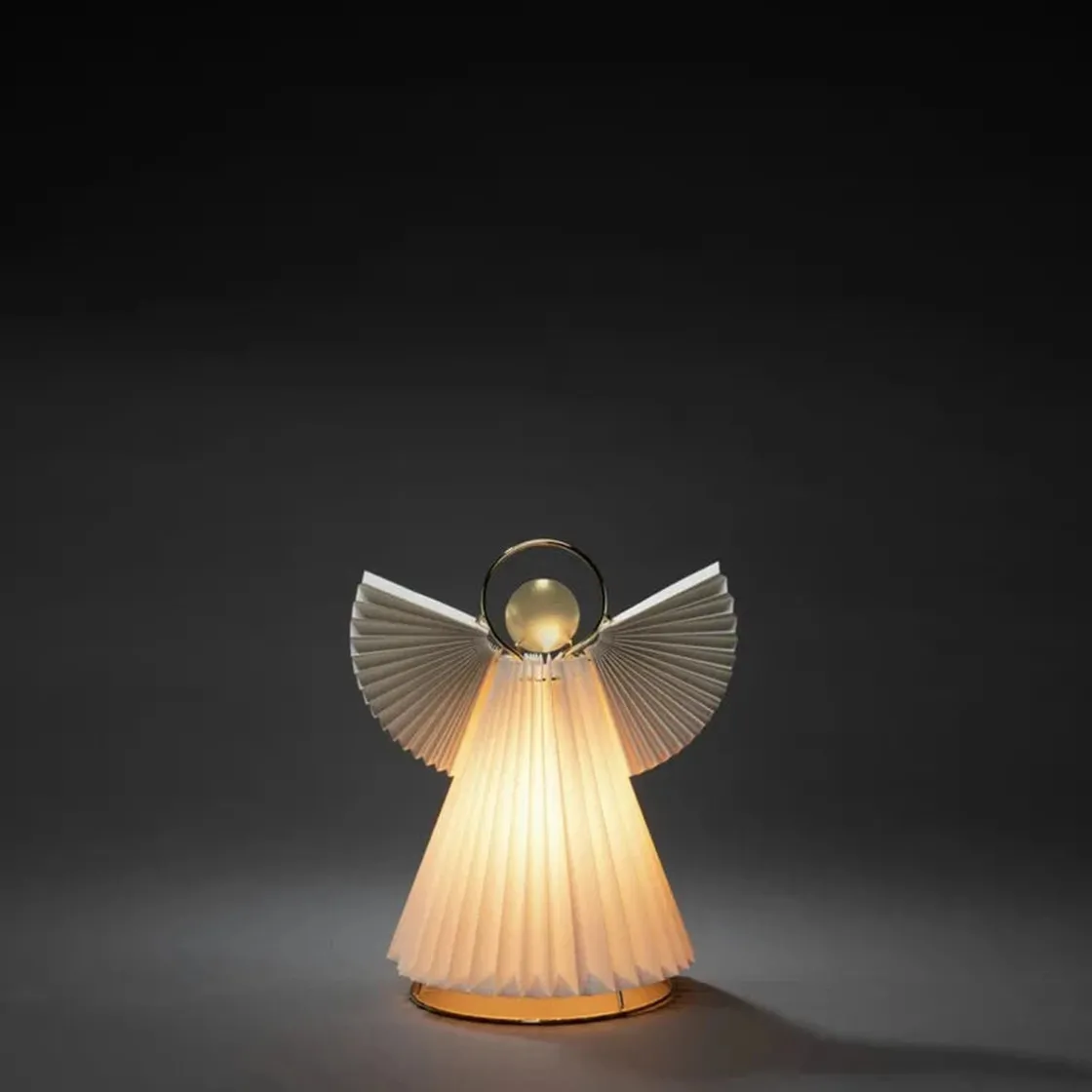 Engel i papp og messing. 26 cm høy. E14 lampeholder og ledning med bryter.