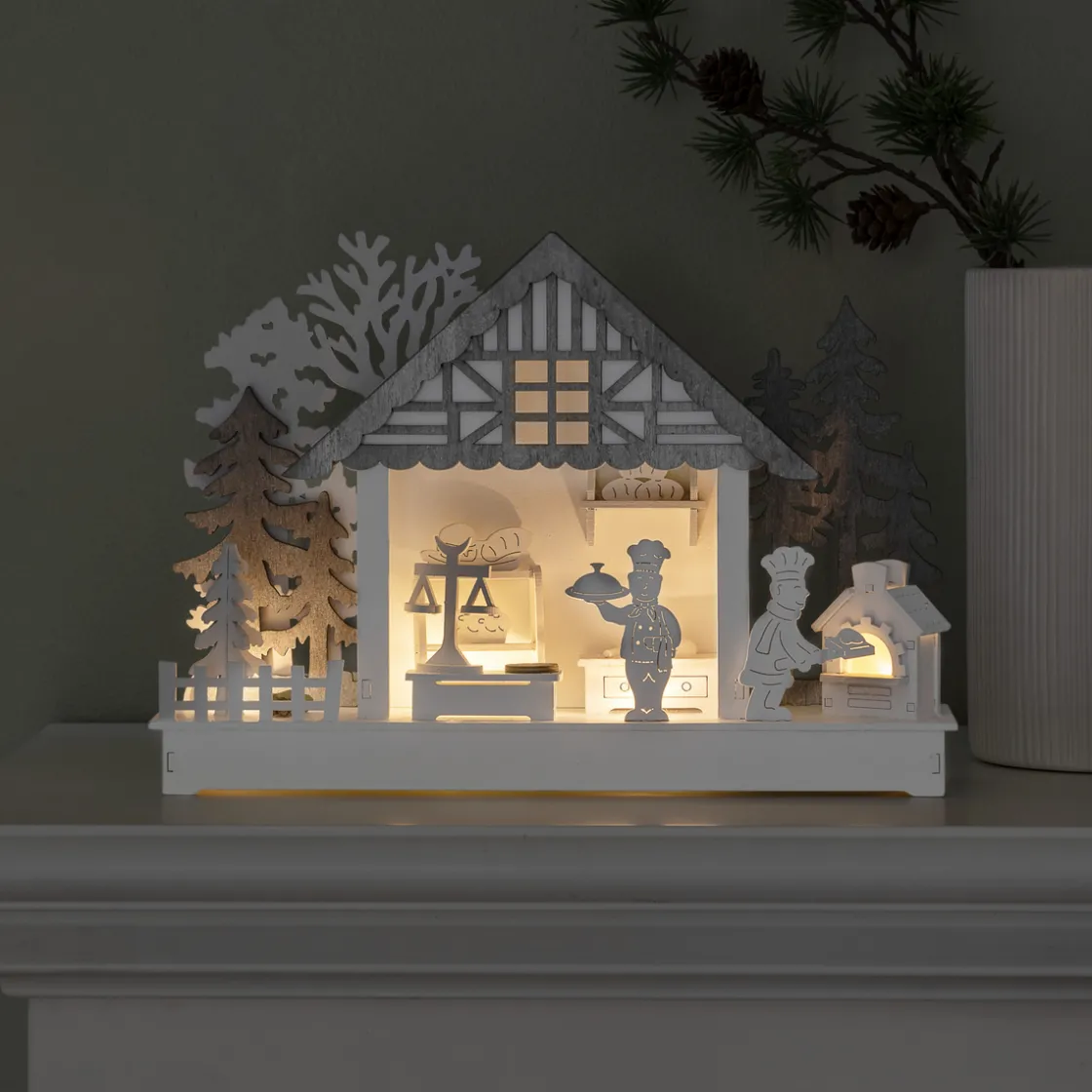 En søt juleby med bakere som gjør klar julebaksten med hvitt/grått treverk.