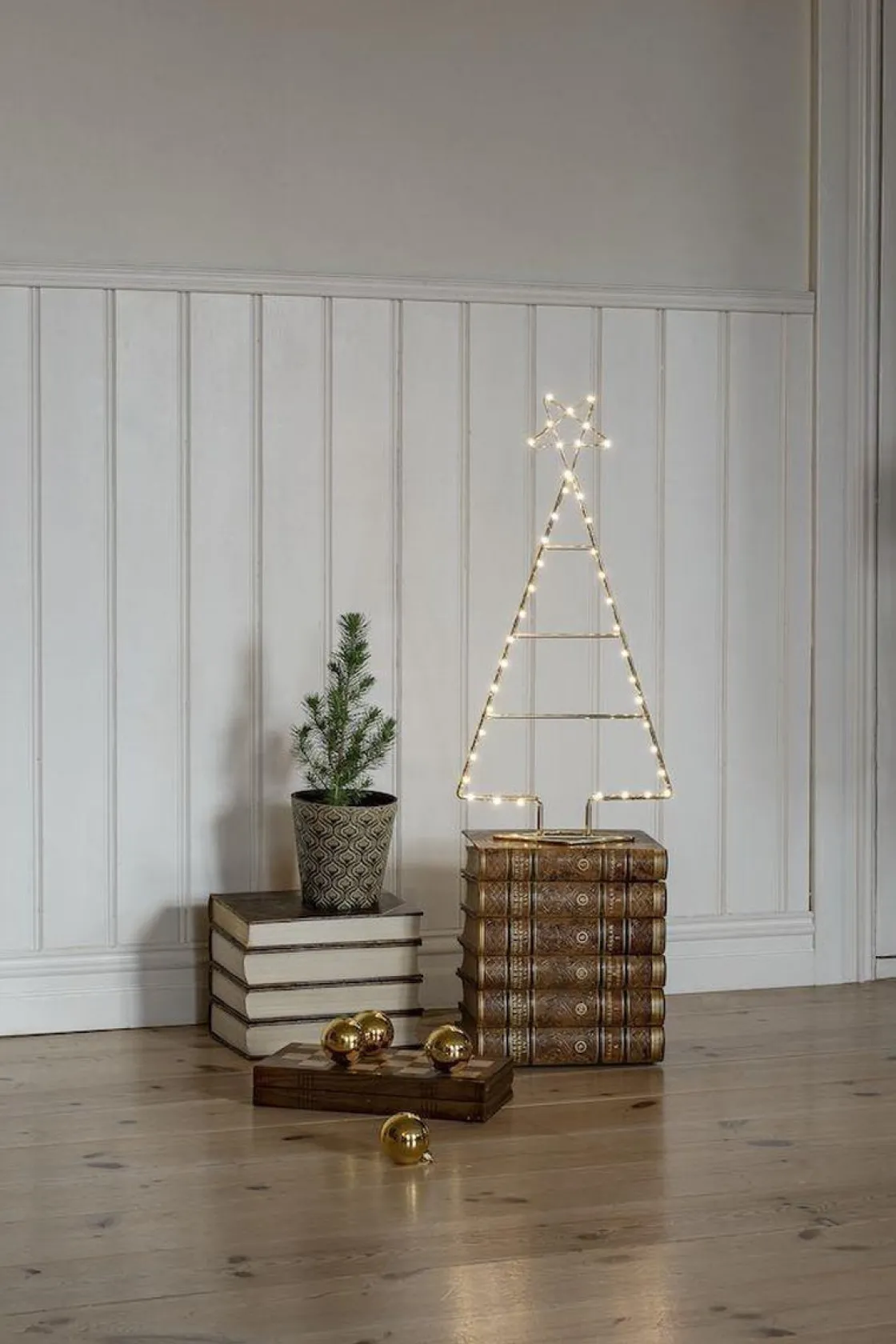 Messinglakkert metallgran med 45 amberfargede LED. Messingfarget kabel. Inkludert transformator.