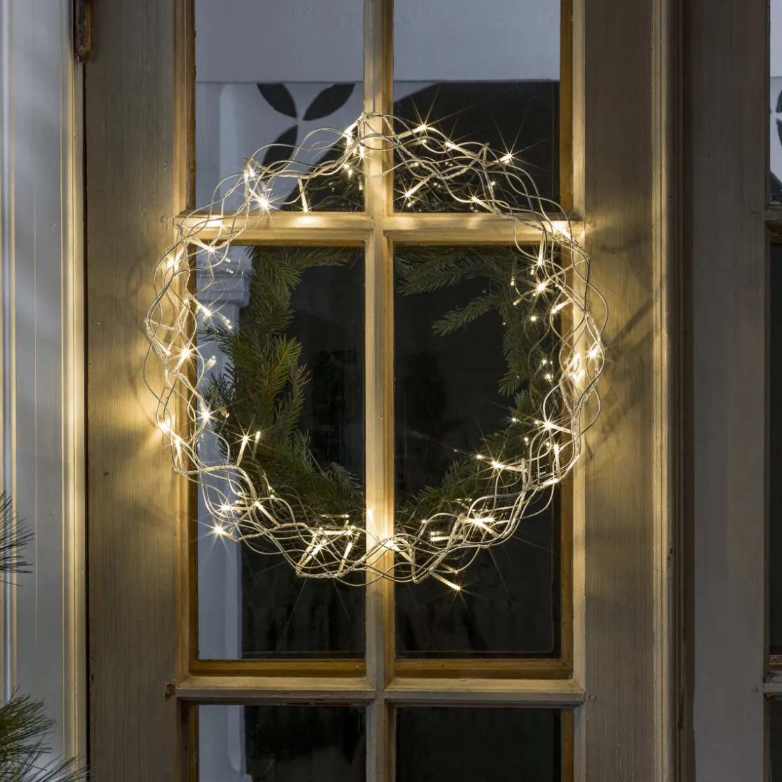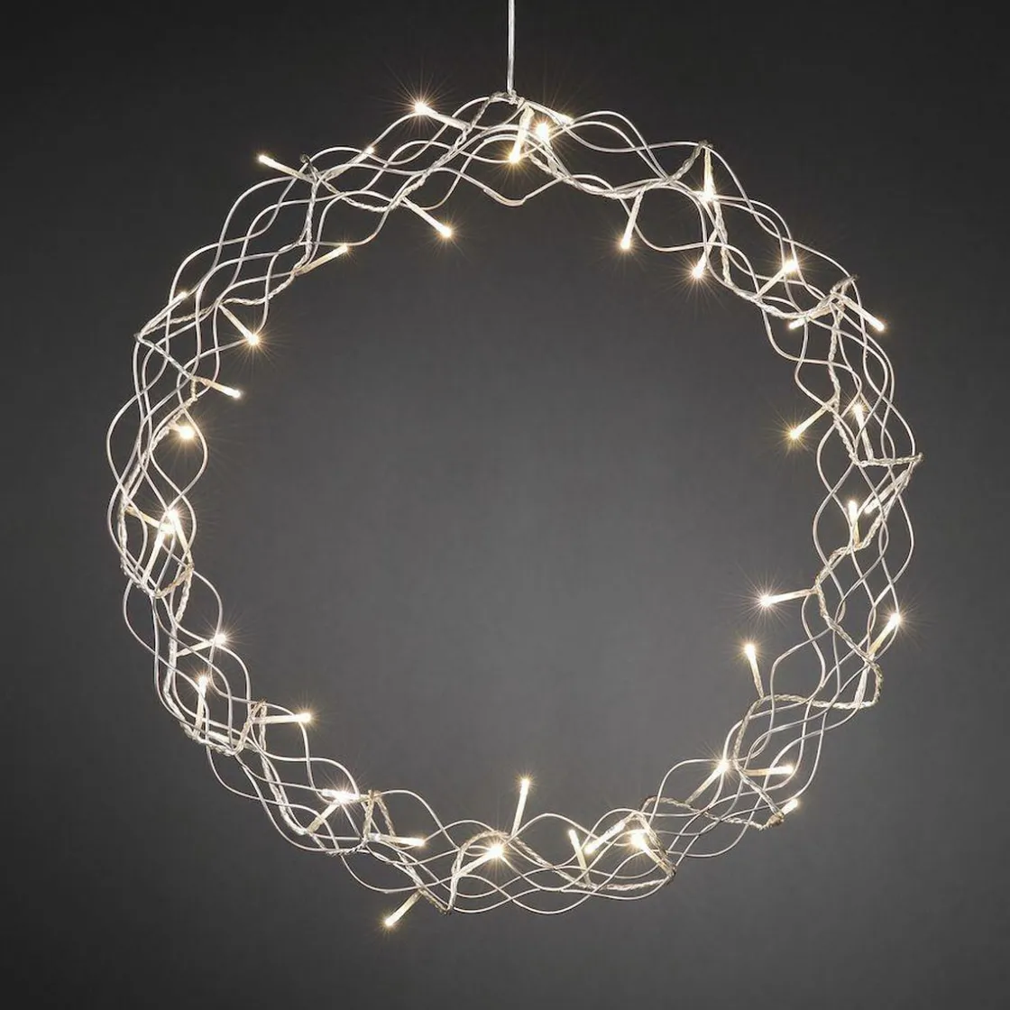En lekker serie kranser, stilrene med pent varmhvitt LED-lys.