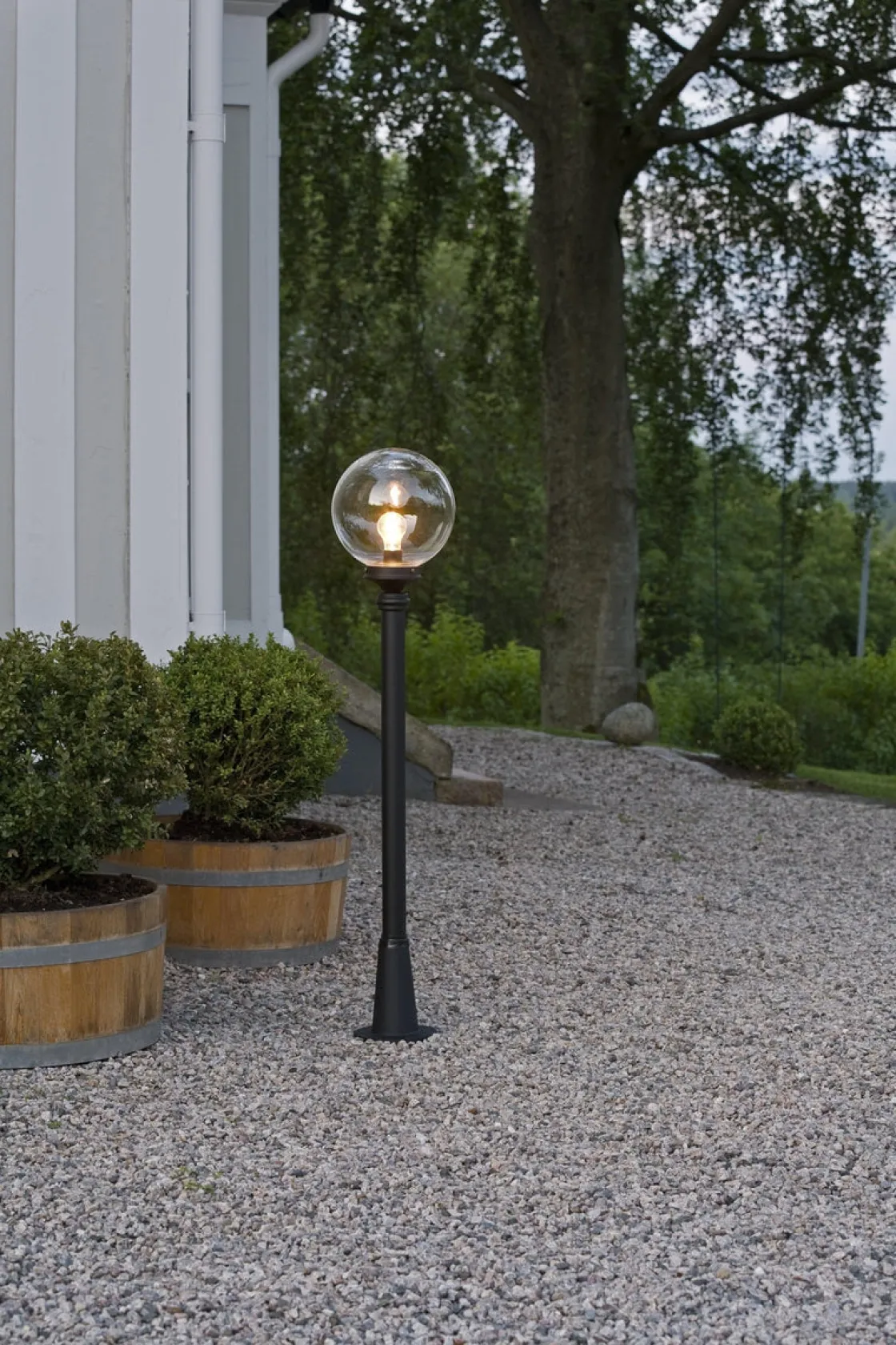 Svart Orion-lysstolpe med glasskuppel i klar farge, som passer perfekt for hage eller gangvei.