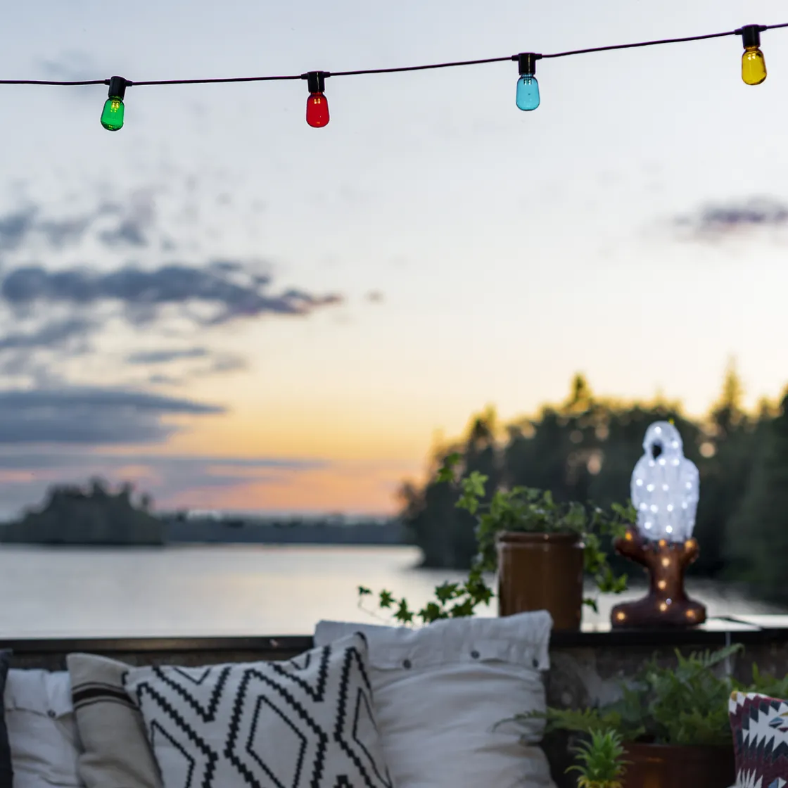 Lysslynge med 20 flerfargede LED-lamper. Faststøpte lyspærer og kuppel i plast som gjør dem uknuselig. Lysene i ulike farger er med på å skape ekstra leken, men koselig stemning. Lyspærene er 5 cm høye og 3 cm i diameter.