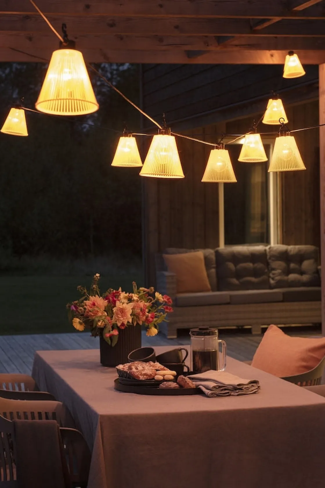Nydelig lysslynge med amberfarget/varmt lys, som er med på å skape ekstra koselig stemning. Lyspærene henger ned fra hovedledningen og har krok på hvert lyspunkt. Lysslyngen leveres med gule skjermer og transformator som har innebygget dimmer, slik at du kan justere lysstyrken etter behov.