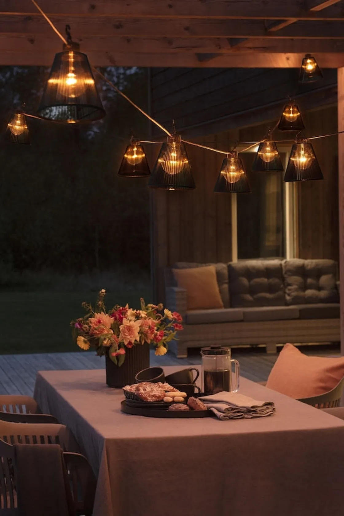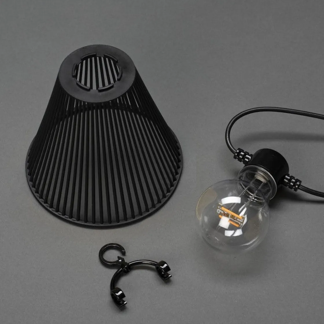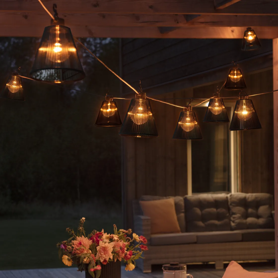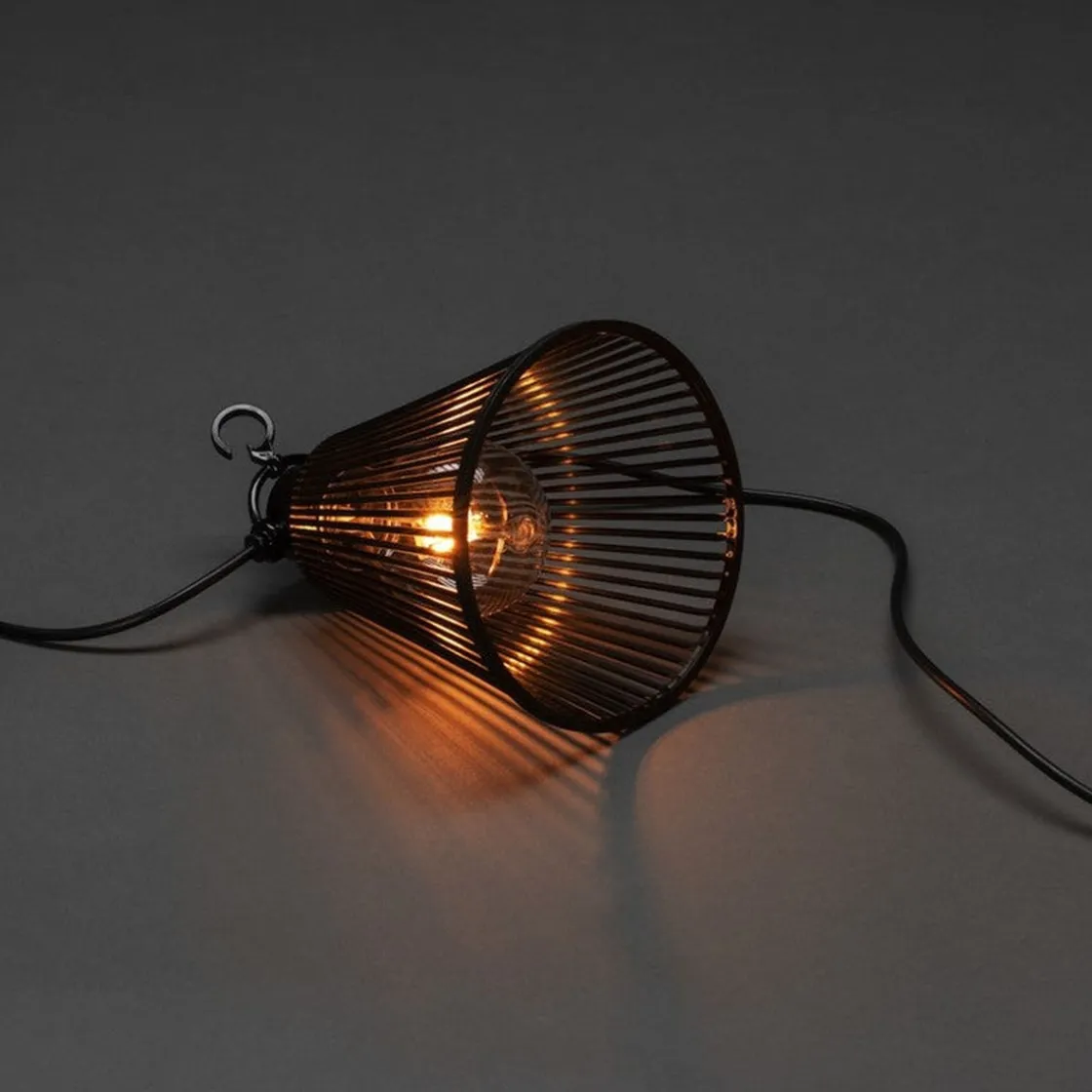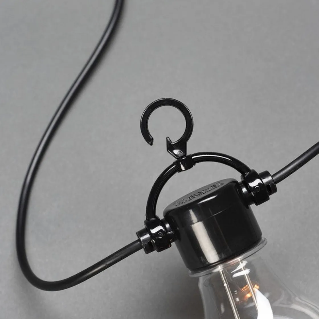 Nydelig lysslynge med amberfarget/varmt lys, som er med på å skape ekstra koselig stemning. Lyspærene henger ned fra hovedledningen og har krok på hvert lyspunkt. Lysslyngen leveres med svarte skjermer og leveres uten transformator