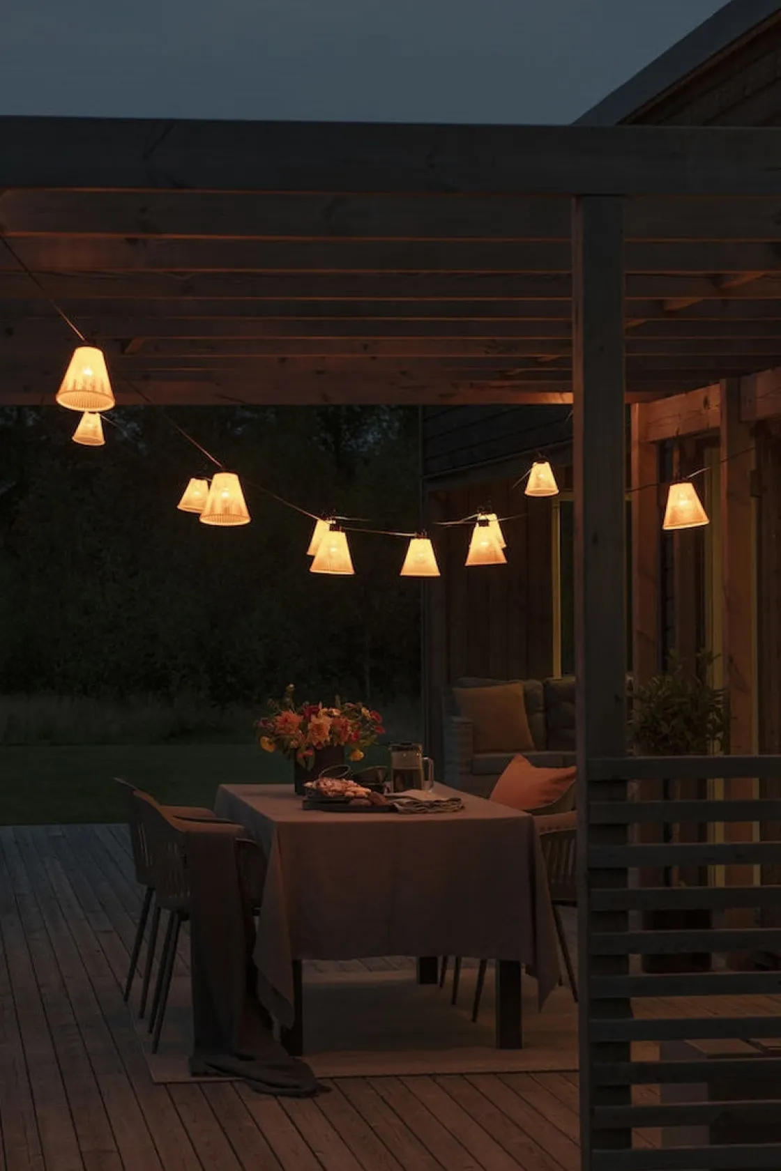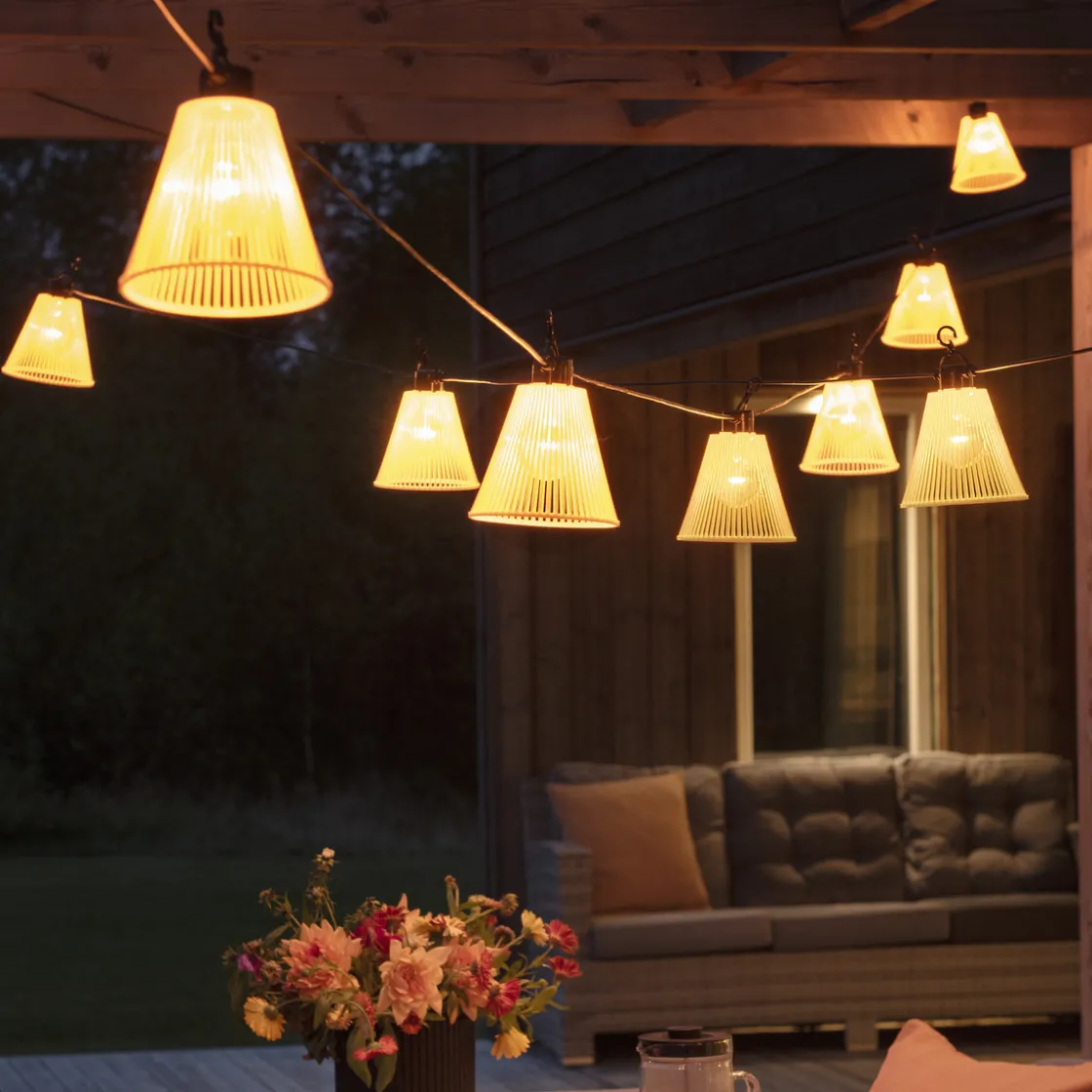 Nydelig lysslynge med amberfarget/varmt lys, som er med på å skape ekstra koselig stemning. Lyspærene henger ned fra hovedledningen og har krok på hvert lyspunkt. Lysslyngen leveres med gule skjermer og leveres uten transformator