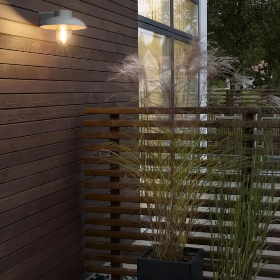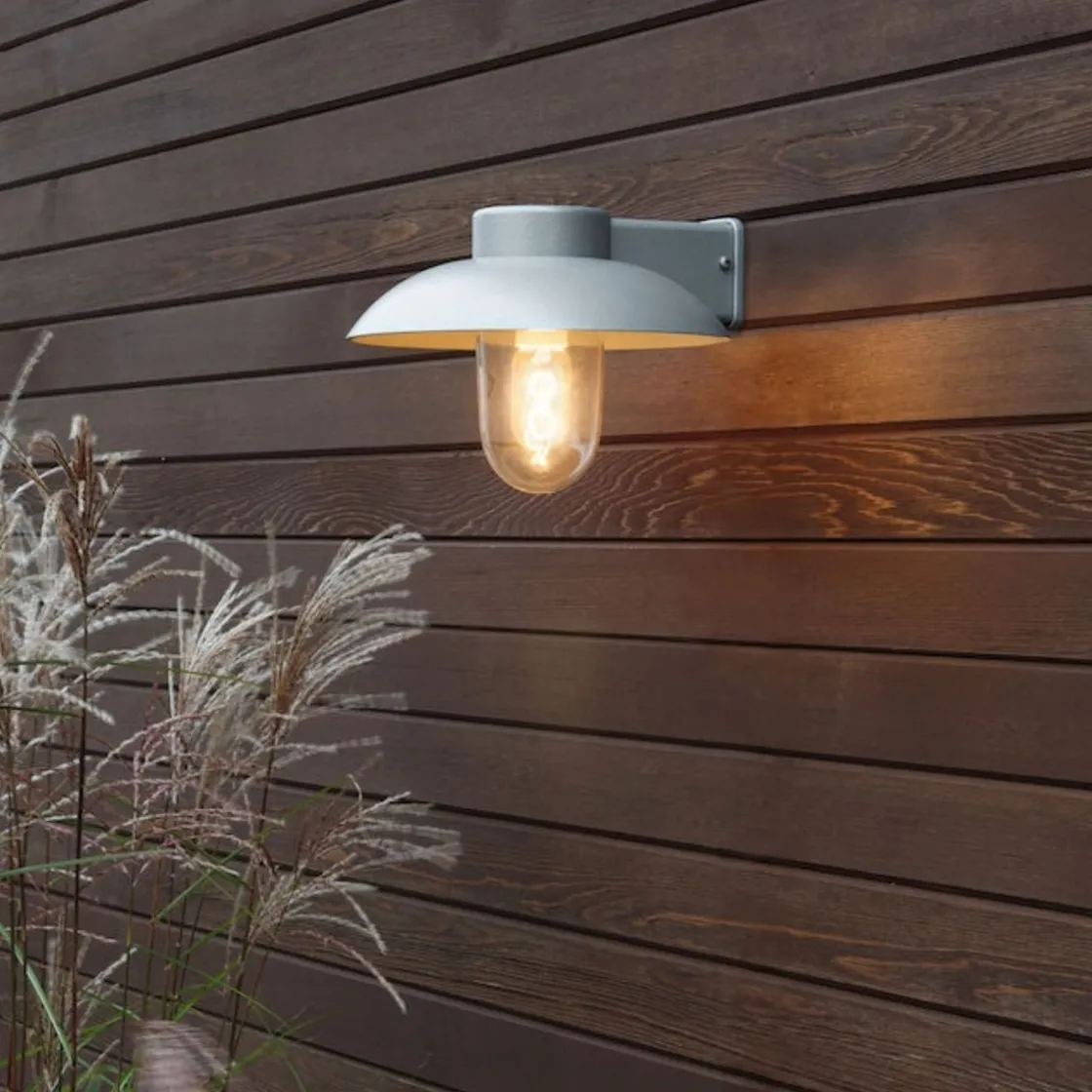 Mani er en hvit og moderne vegglampe for utendørs bruk som vender ned.