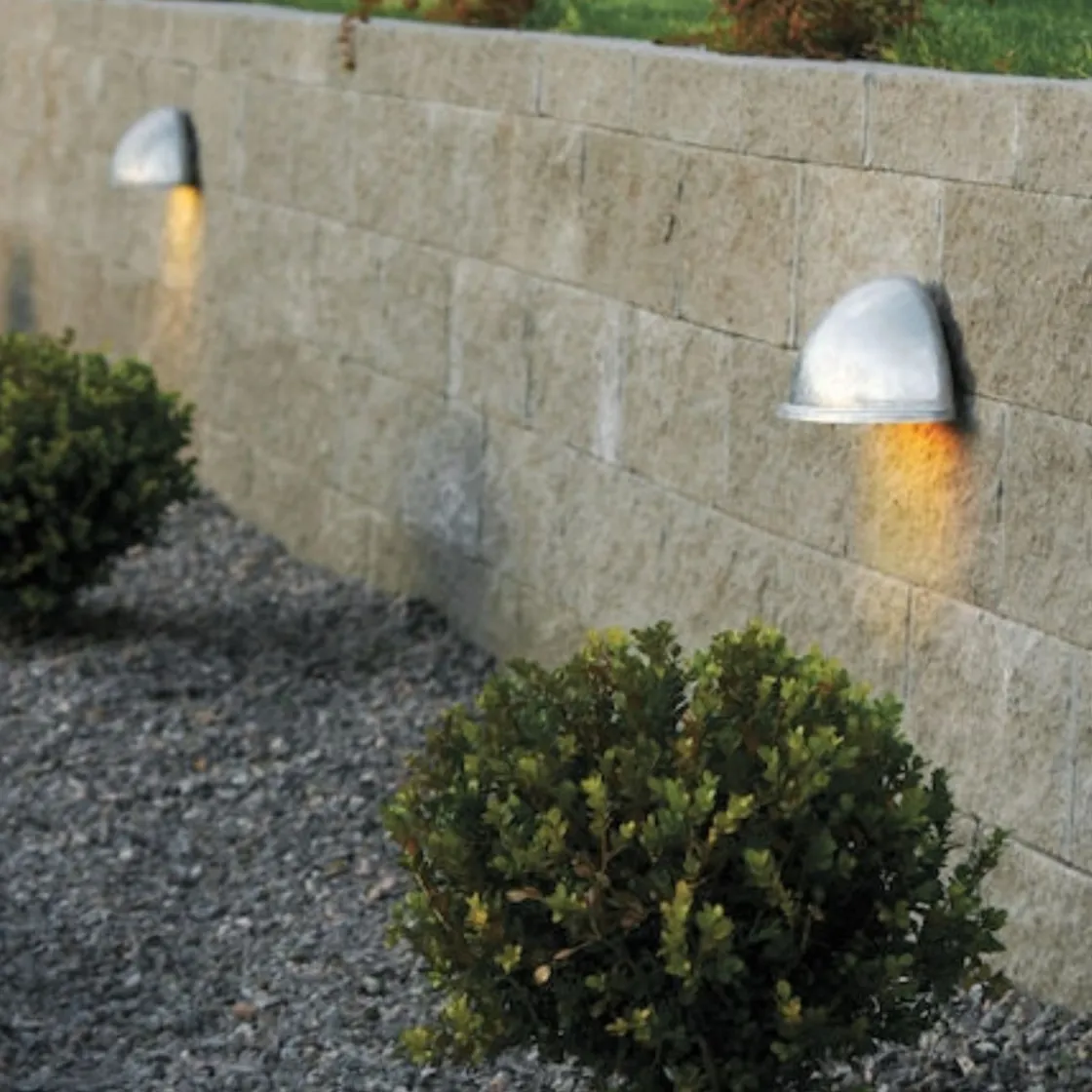 Stor galvanisert vegglampe som er utformet som en halvmåne til utendørs bruk.