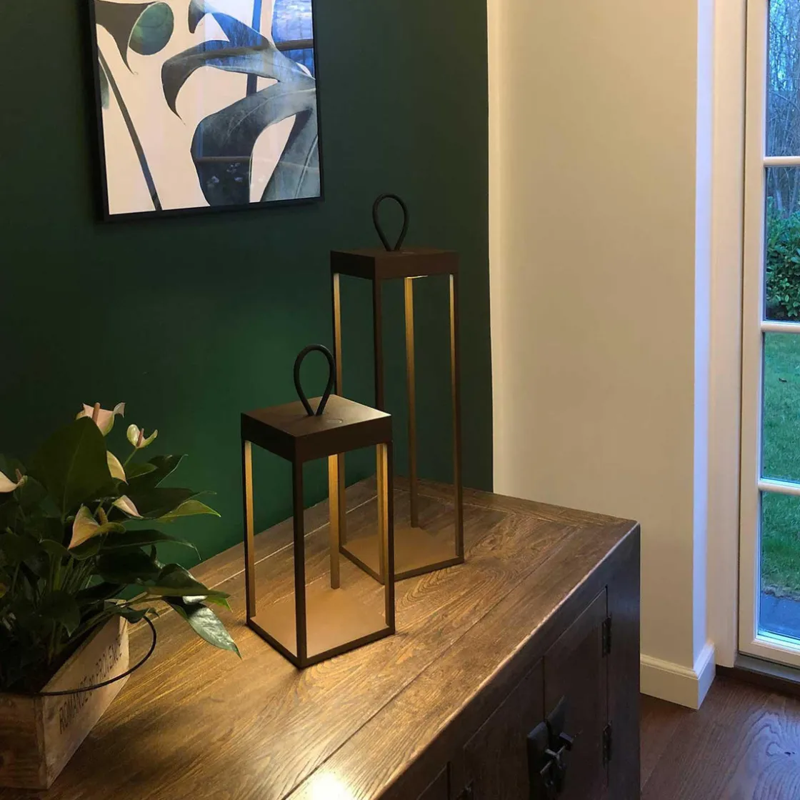 Lucerna 50 Corten imponerer med sin trendy design og energisparende og batteridrevet belysningsteknologi. Formelt ligner den en klassisk lanterne, men det integrerte Li-Ion-batteriet, som sørger for at lampen kan tennes i 9 timer med 100% lysintensitet, gjør den uforlignelig med den velkjente klassiske lanterne. Med et helt tomt batteri tar det omtrent 6 timer å lade det for å få en lysintensitet på 100% igjen. Den har en berøringsbryter med dimmer og en USB-stikk på toppen samt et silikonhåndtak som alt i alt gjør det enkelt å bruke og enkelt å flytte den rundt.