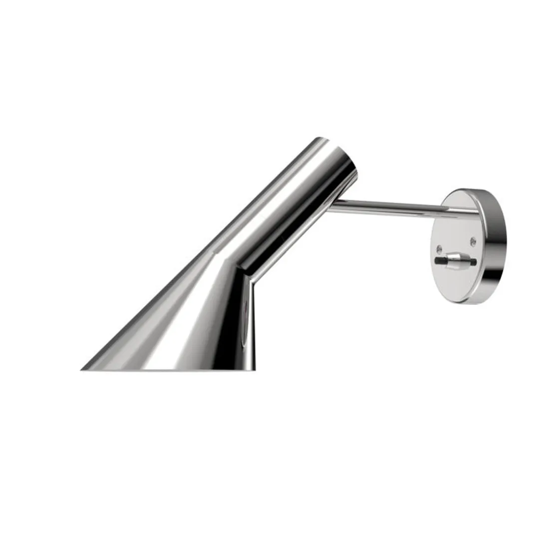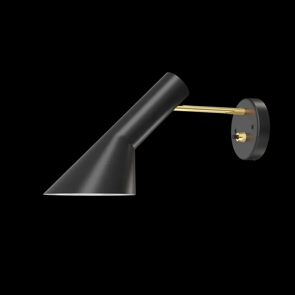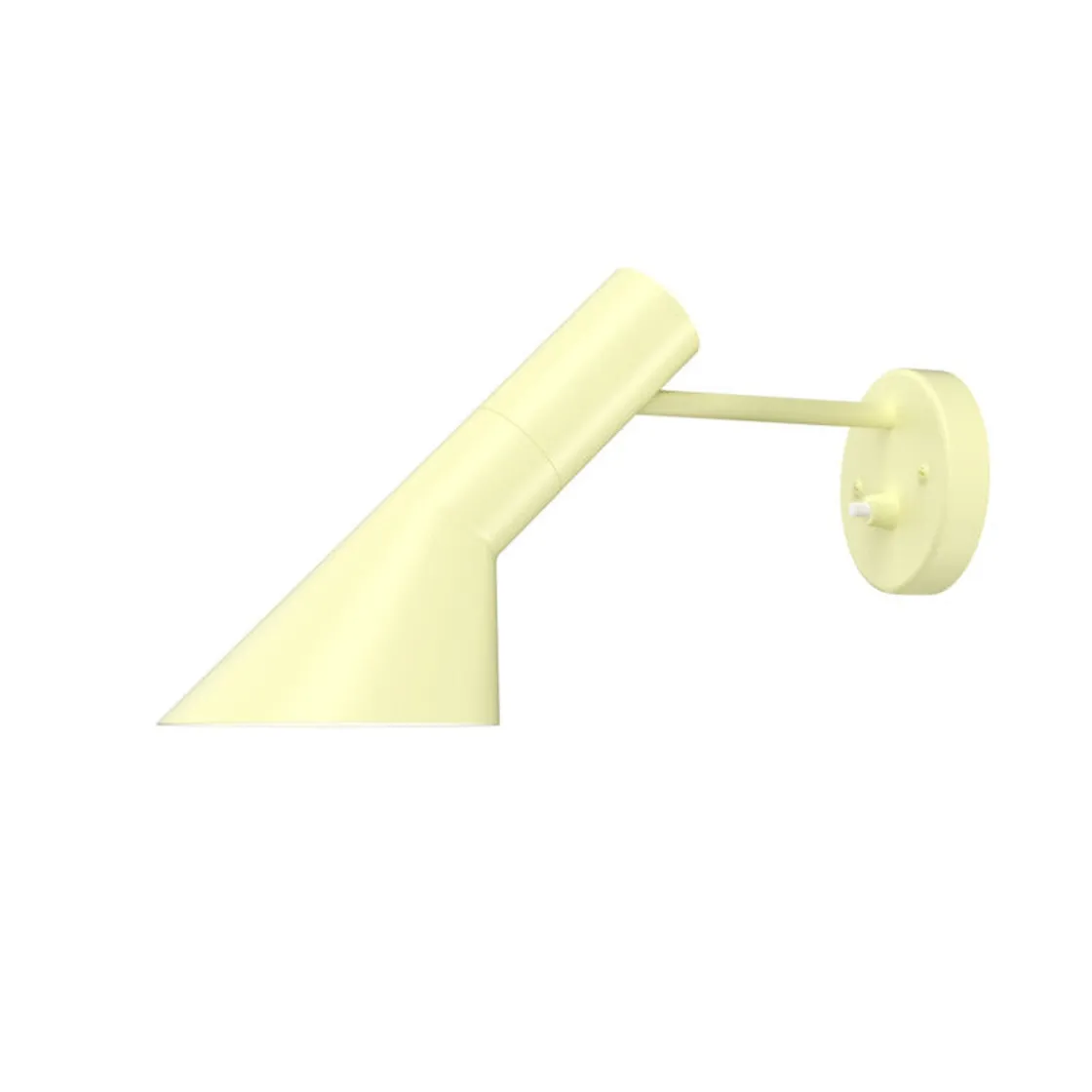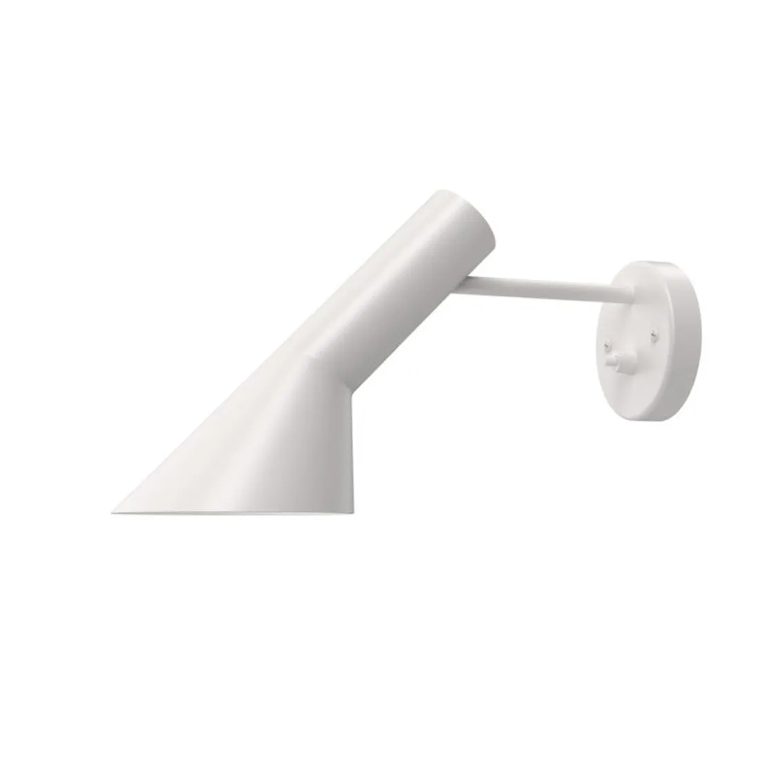 AJ vegglampen sender ut et direkte nedadrettet lys. Vinkelen og rotasjonsretningen på skjermen kan justeres for å optimalisere lysfordelingen. Skjermen er malt hvit på innsiden for å gi et mykt og komfortabelt lys. Denne varianten leveres uten ledning men med bryter på basen, beregnet på direkte tilkobling.