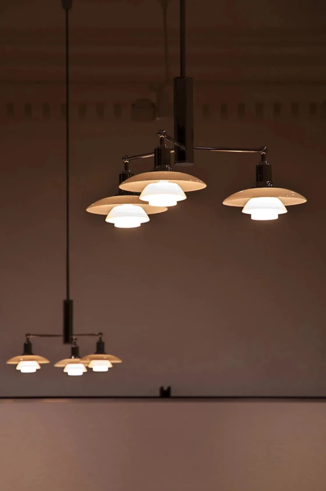 PH2/1 lysekrone fra Louis Poulsen er designet etter et prinsipp basert på et reflekterende tre-skjermssystem som styrer det meste av lyset nedover. Skjermene er laget av munnblåst trelags opalt glass som er blankt på toppen og sandblåst matt på undersiden. Dette gir en myk og jevn lysfordeling.