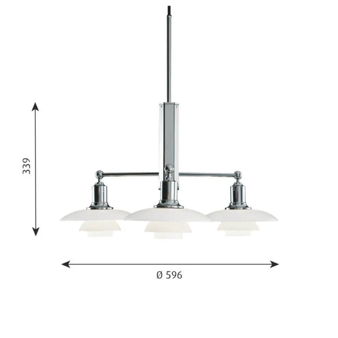 - Materiale: Skjermer: Munnblåst, hvitt opalt glass. Oppheng: høyglanset krombelagt, ekstrudert aluminium.