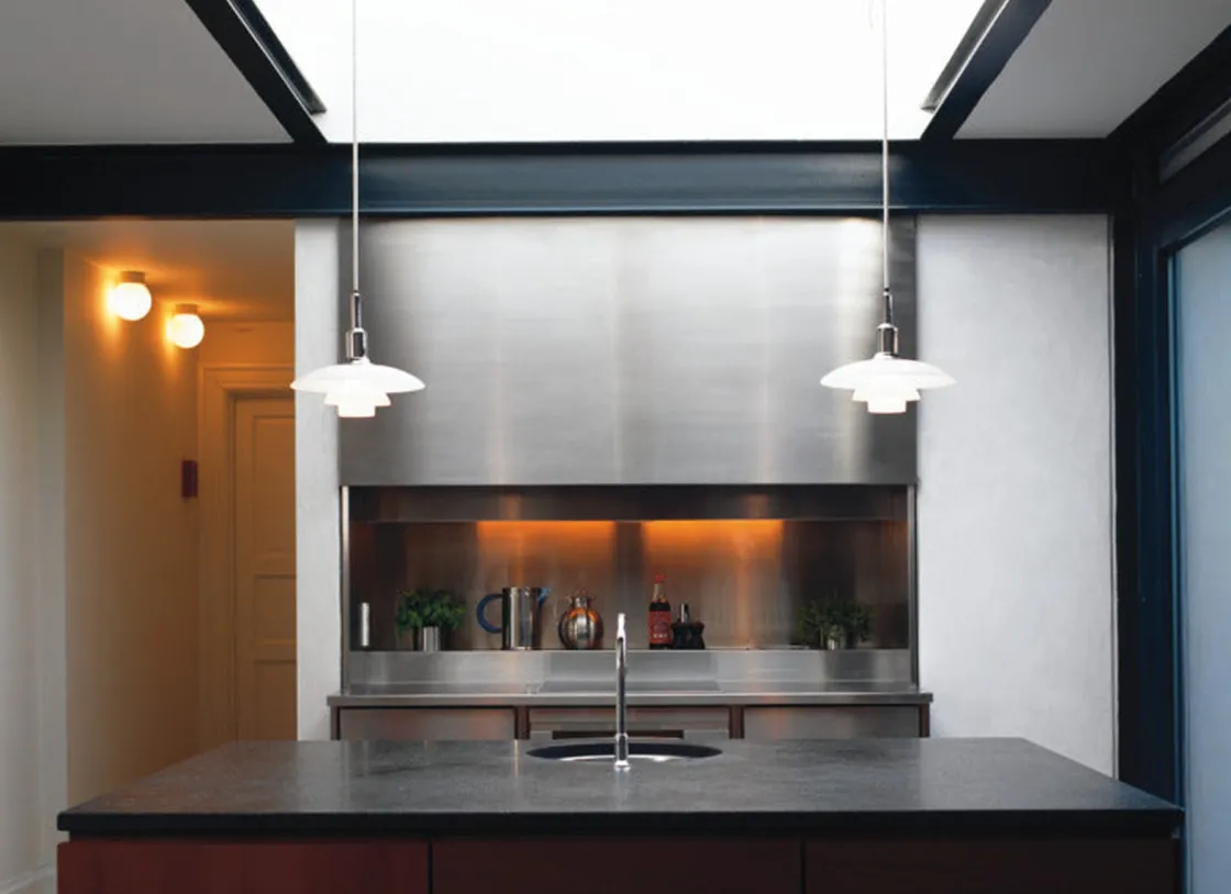 PH3/2 taklampe fra Louis Poulsen er designet etter et prinsipp basert på et reflekterende tre-skjermssystem som styrer det meste av lyset nedover. Skjermene er laget av munnblåst trelags opalt glass som er blankt på toppen og sandblåst matt på undersiden. Dette bidrar til en myk og jevn lysfordeling.