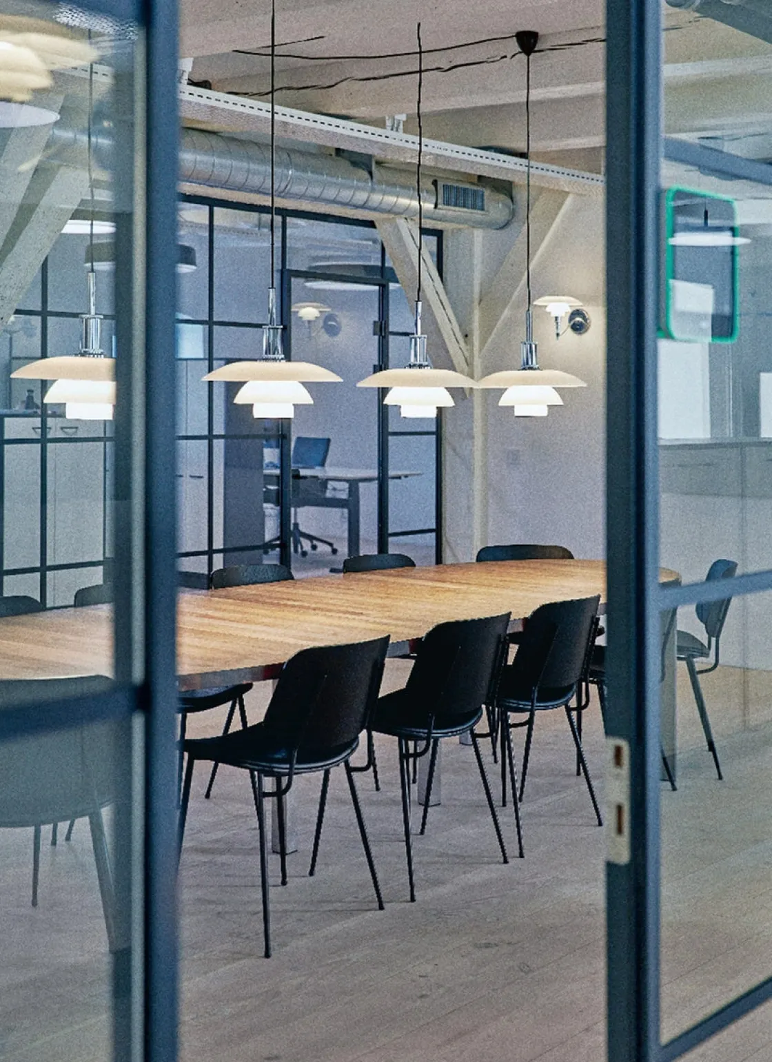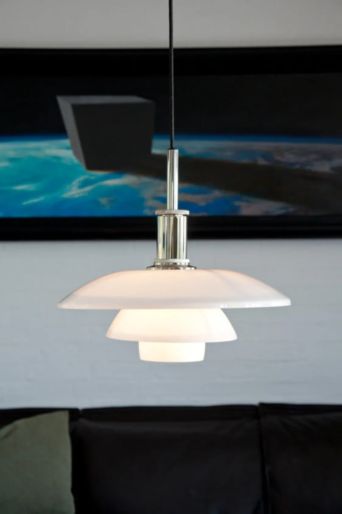- Materiale: Skjermer: Munnblåst, matt hvitt opalt glass. Blendfri skive. Oppheng: Høyglanset krombelagt, ekstrudert aluminium.