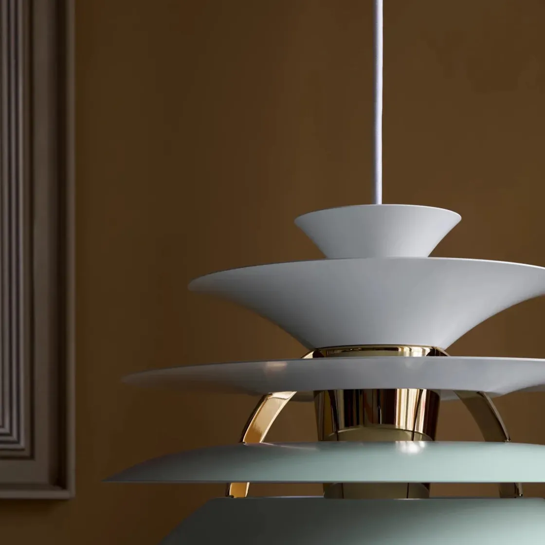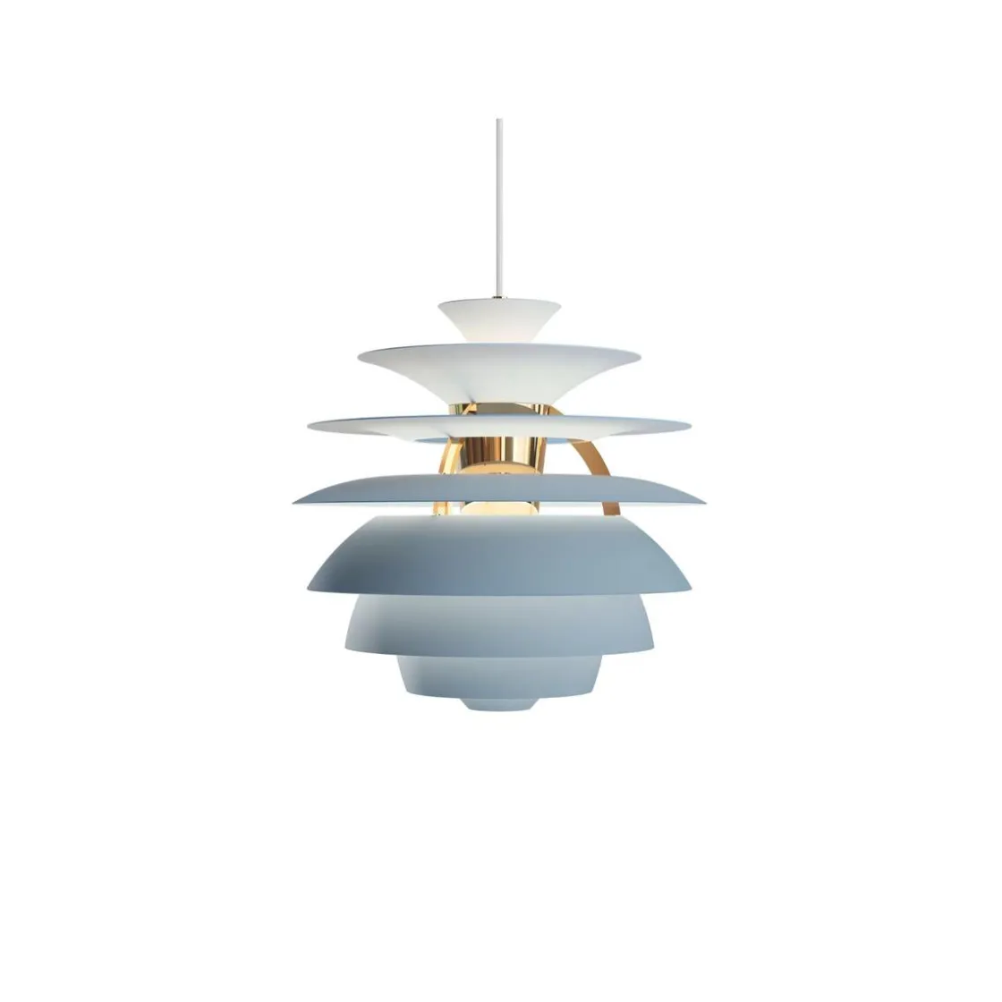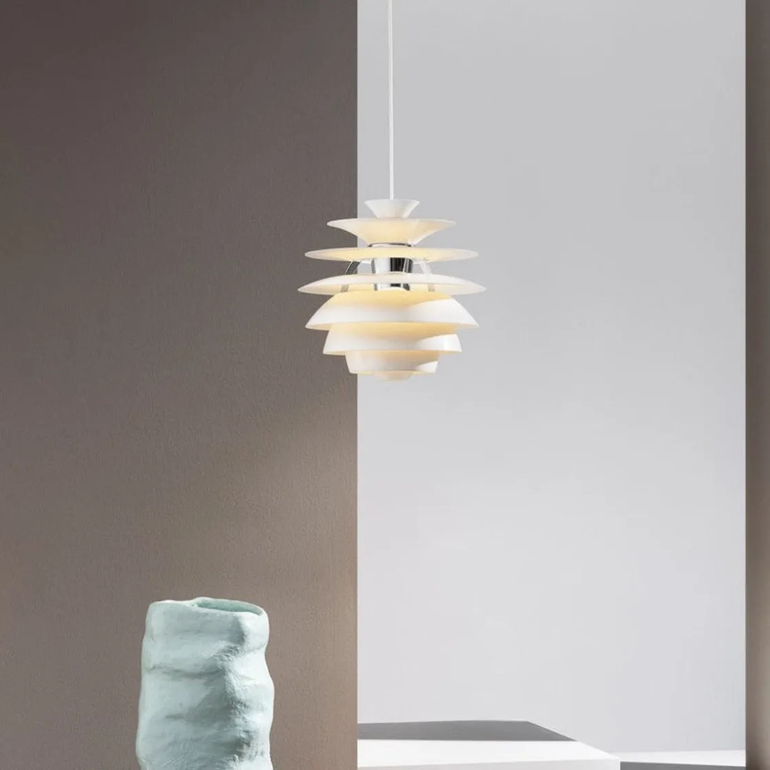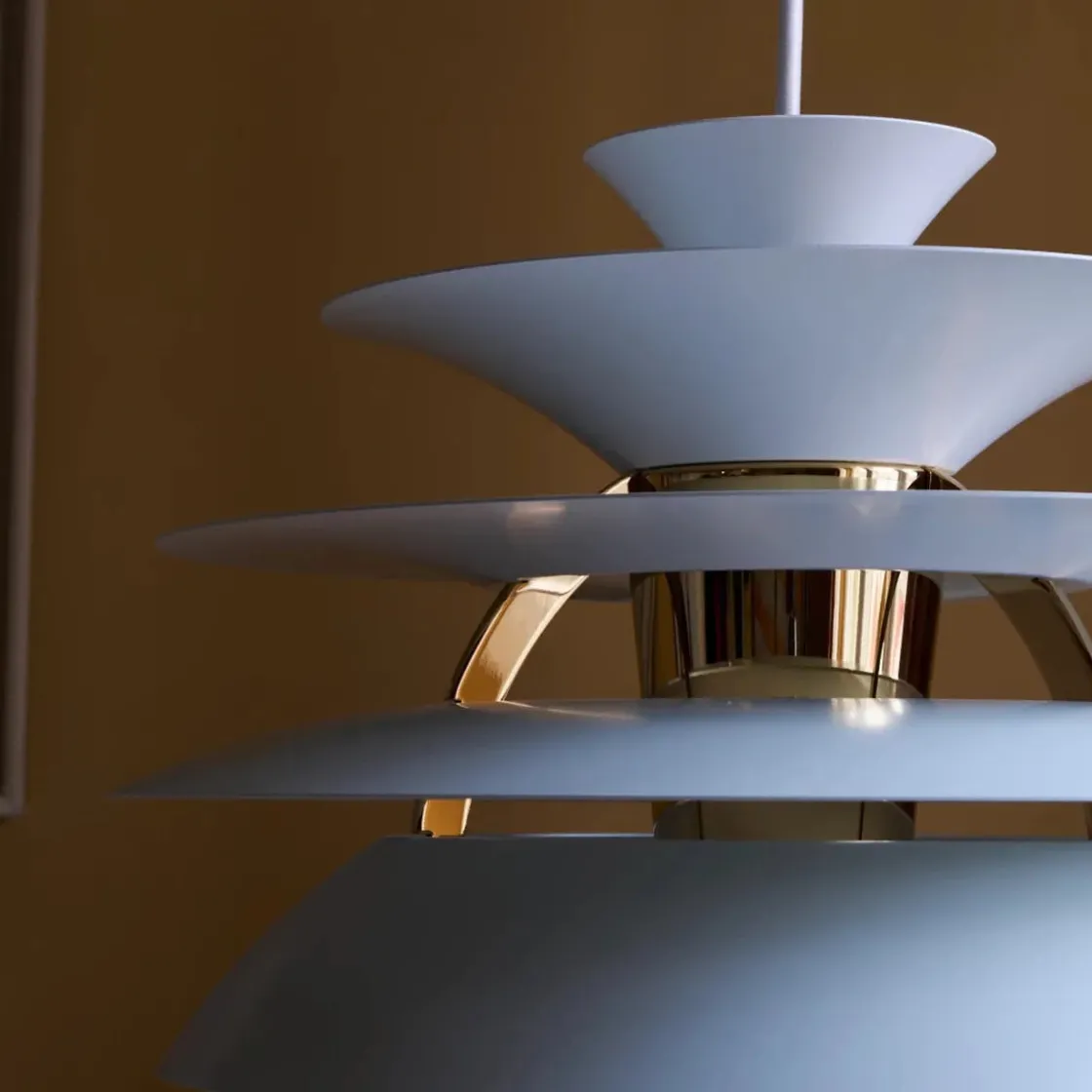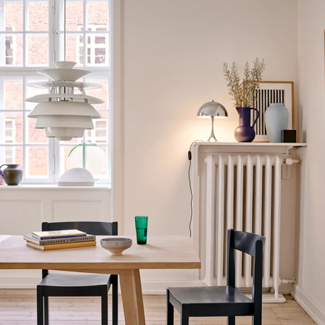PH Snowball fra Louis Poulsen sender ut et komfortabelt og blendfritt dempet lys. Matte, malte undersider og blanke overflater gir en attraktiv refleksjon av det dempede lyset og skaper en jevn belysning rundt armaturen. Når lyset er slått på er den øverste delen opplyst mens den nederste delen forblir mørk.