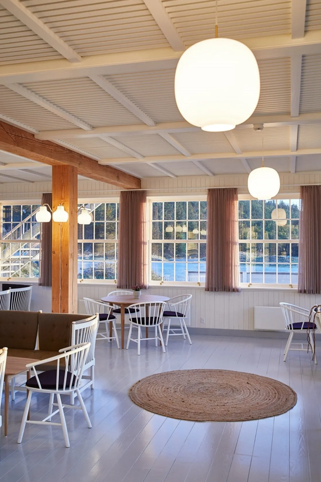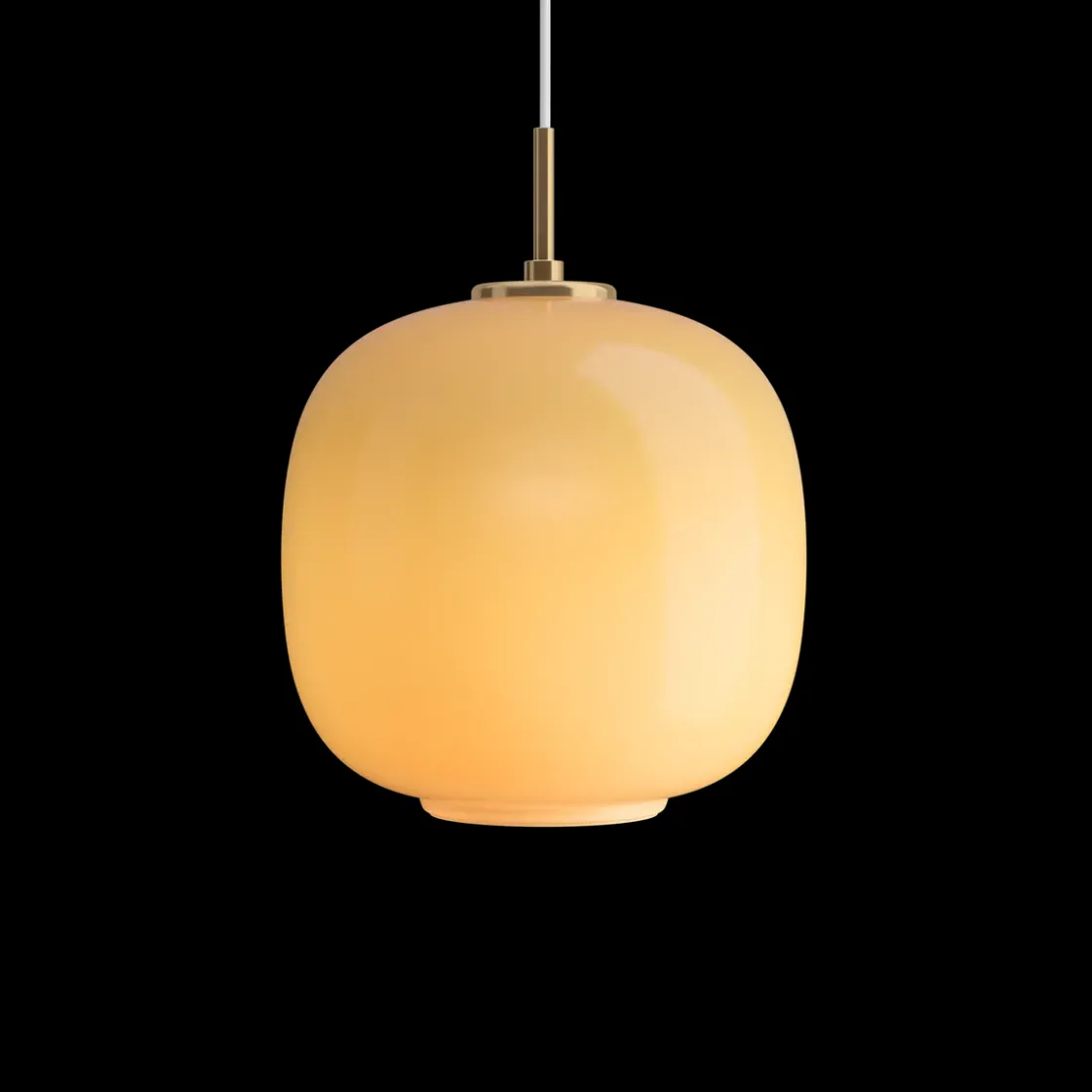- Materiale: Skjerm: Munnblåst, polert, hvitt opalt glass. Pendelfeste: Ubehandlet børstet messing, vil patinere.