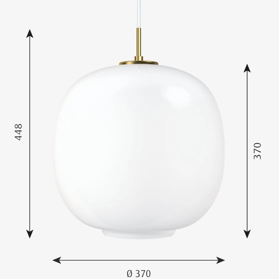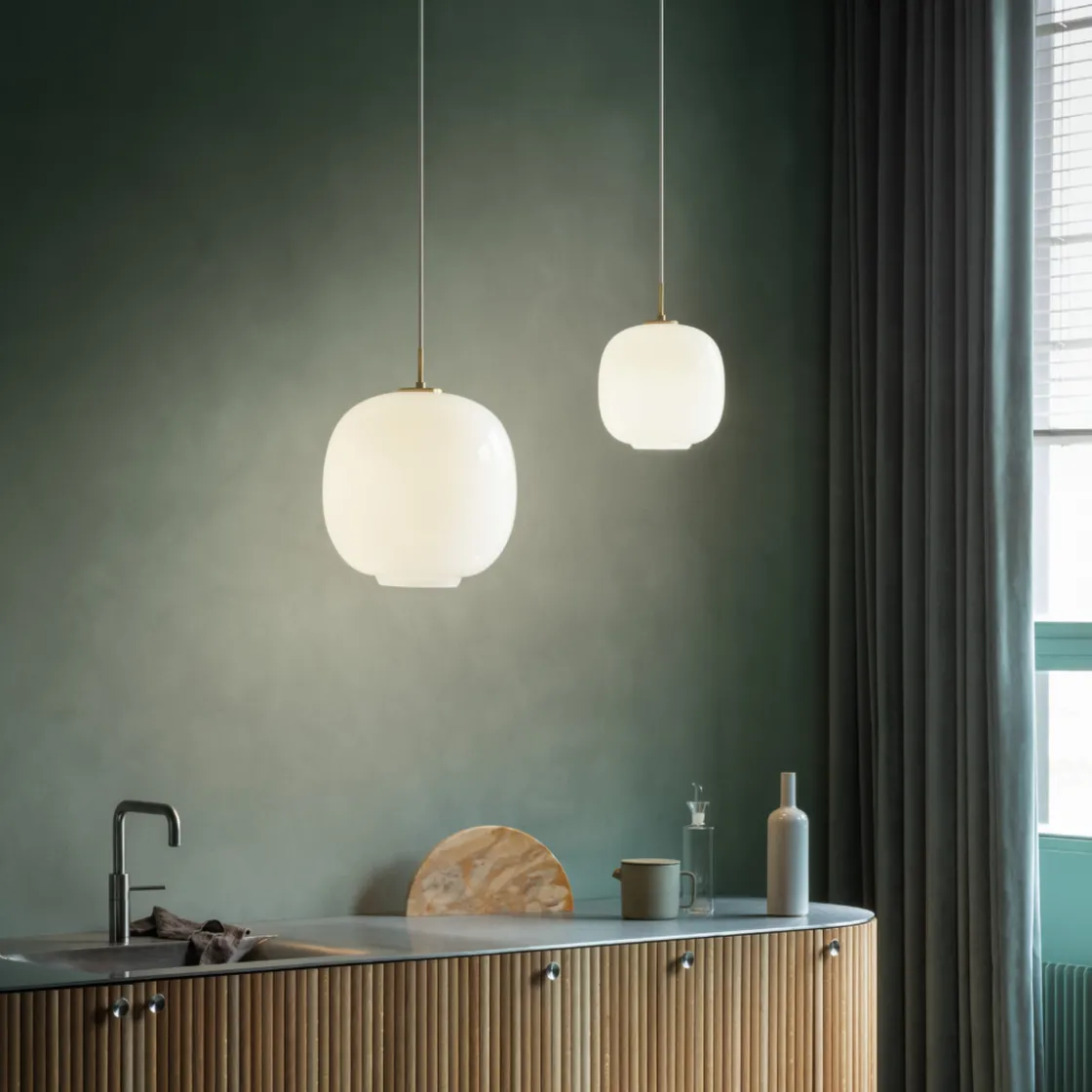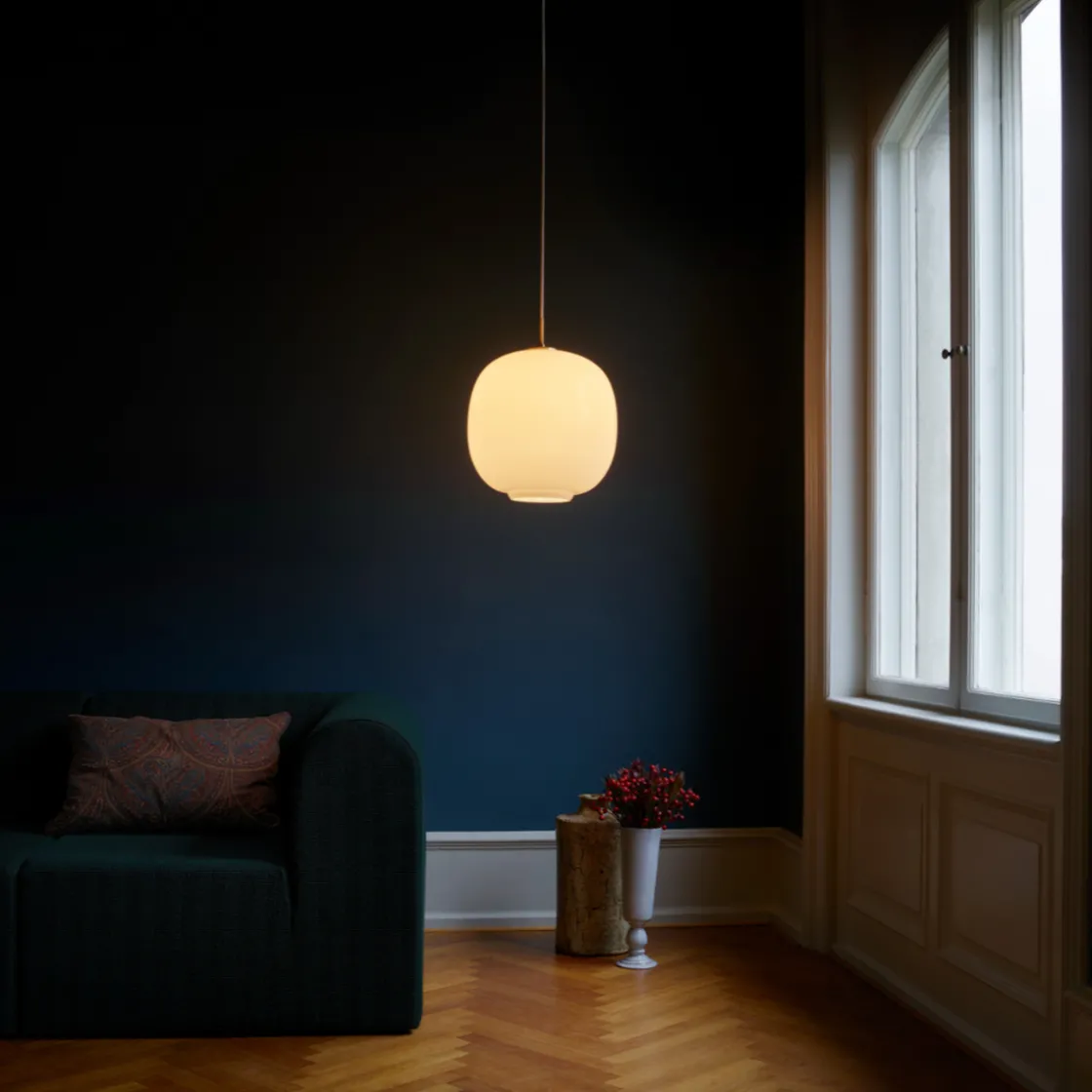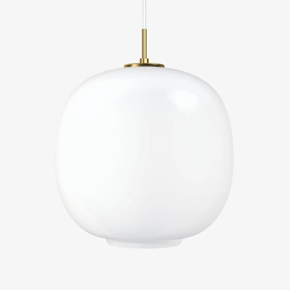 - Materiale: Skjerm: Munnblåst, polert, hvitt opalt glass. Pendelfeste: Ubehandlet børstet messing, vil patinere.