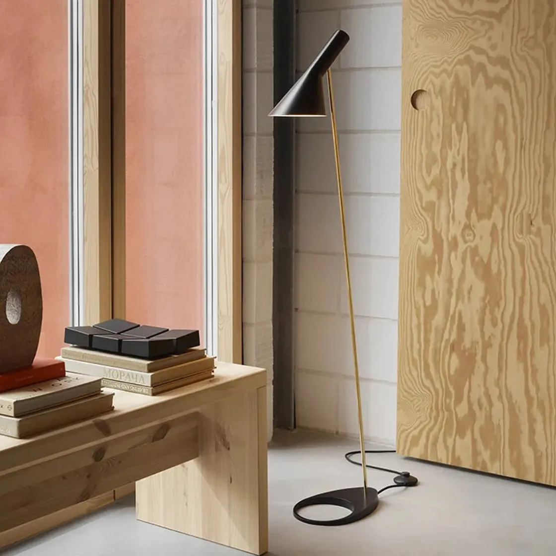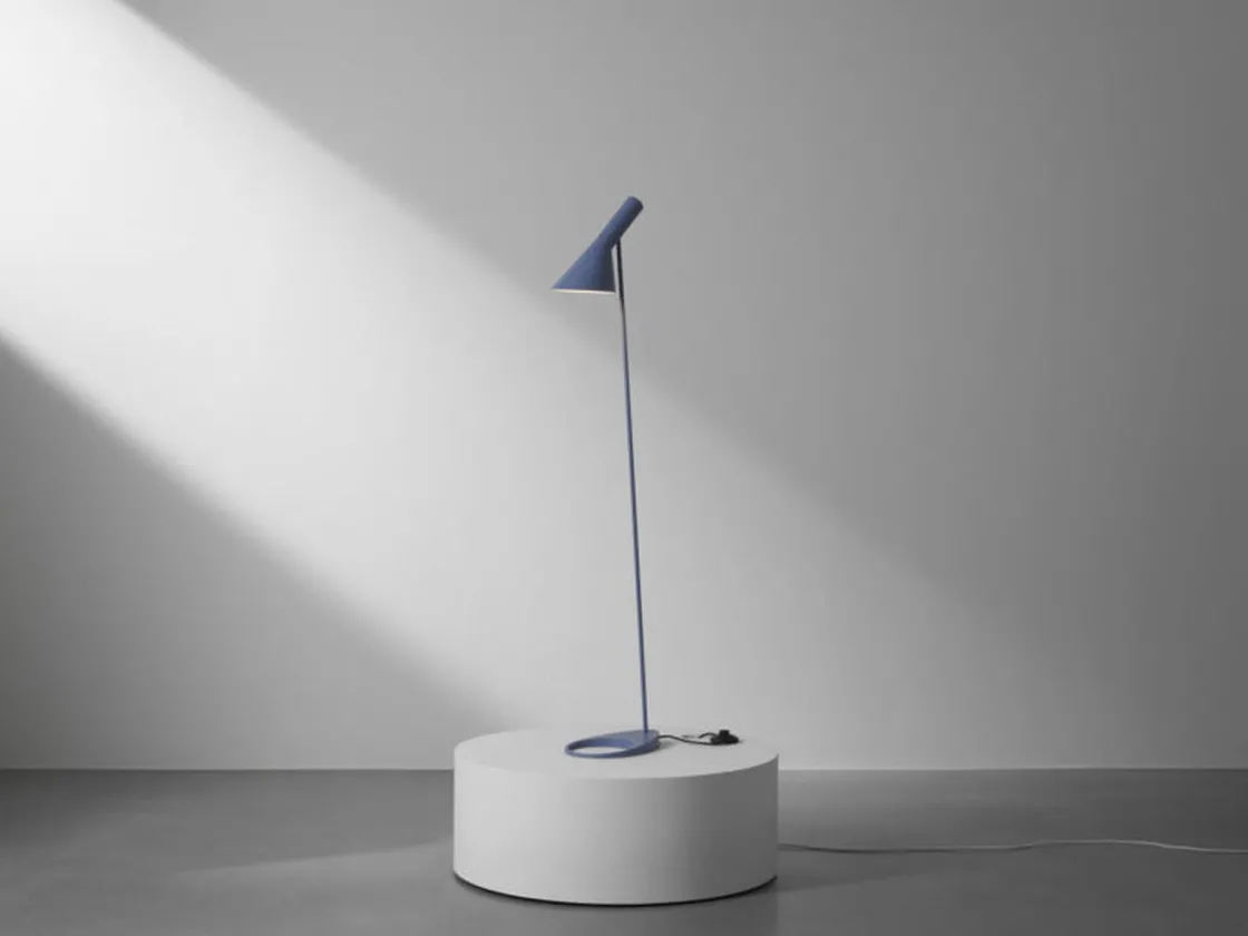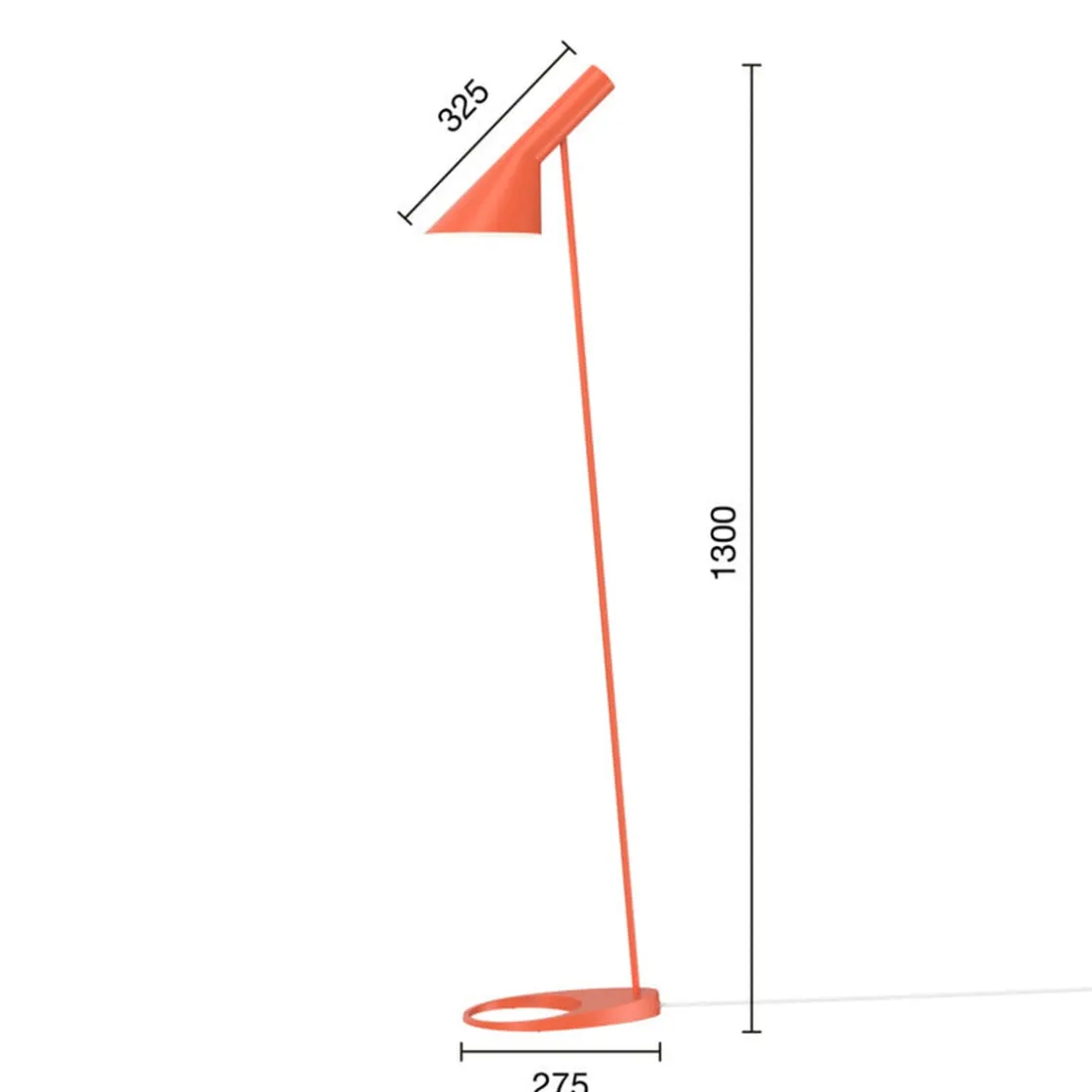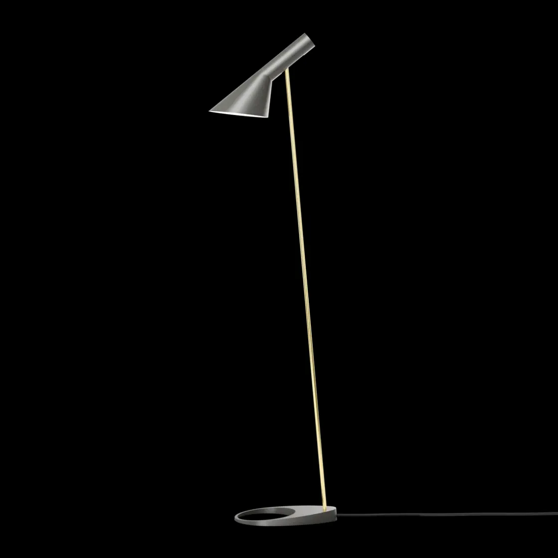 AJ gulvlampe inngår i AJ-serien, ansett som den designen som den danske arkitekten er mest kjent for over hele verden. Lampen sender ut et nedadrettet lys. Vinkelen på skjermen kan justeres for å optimalisere lysfordelingen. Skjermen er malt hvit på innsiden for å gi et mykt og komfortabelt lys.