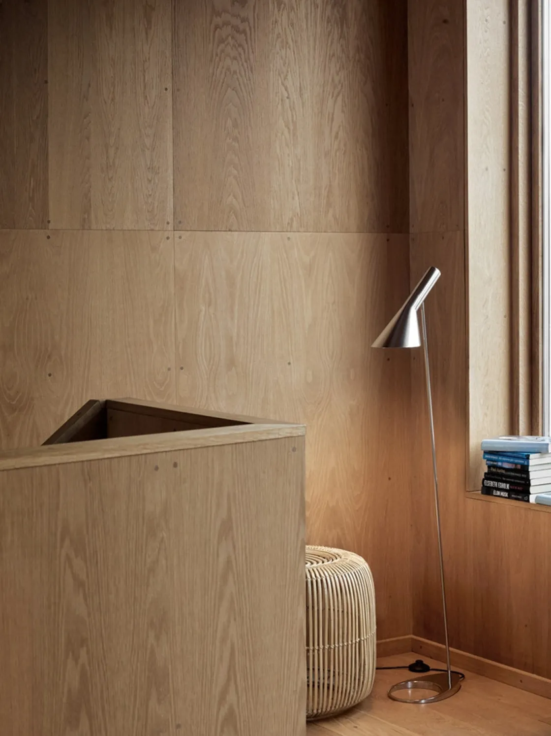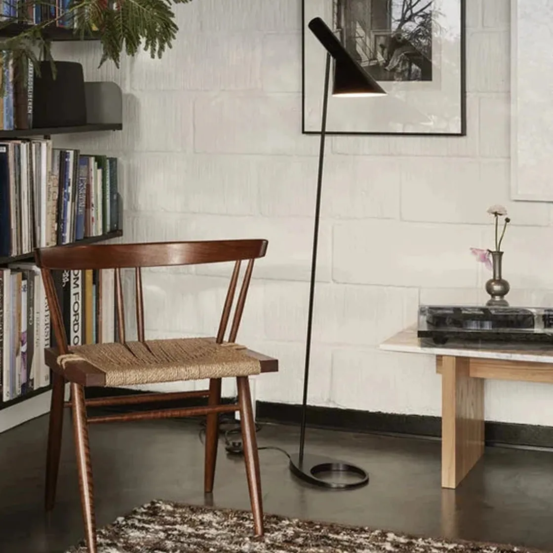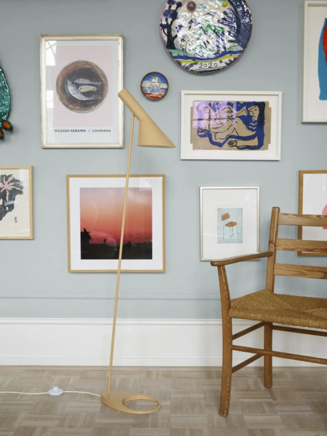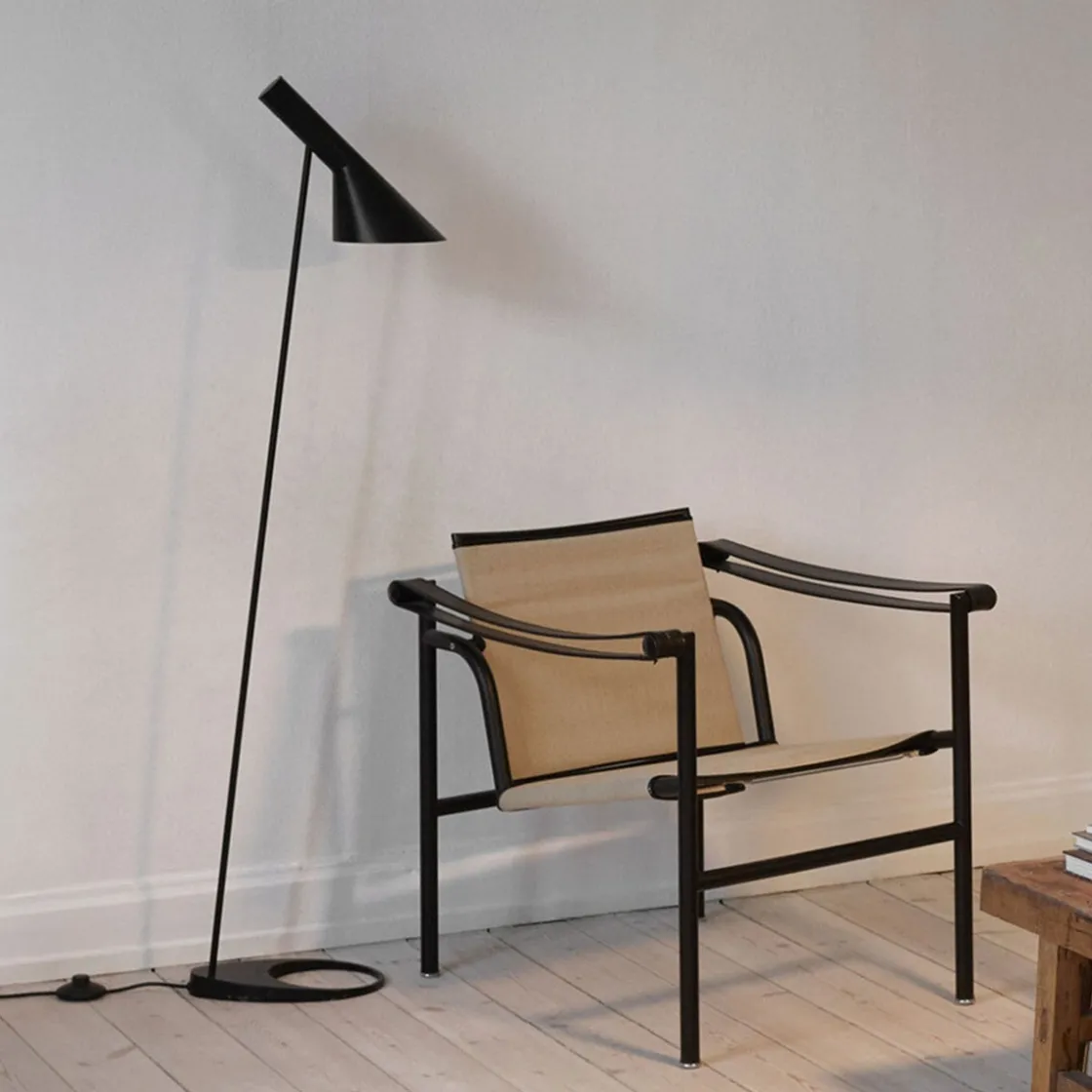 AJ gulvlampe inngår i AJ-serien, ansett som den designen som den danske arkitekten er mest kjent for over hele verden. Lampen sender ut et nedadrettet lys. Vinkelen på skjermen kan justeres for å optimalisere lysfordelingen. Skjermen er malt hvit på innsiden for å gi et mykt og komfortabelt lys.