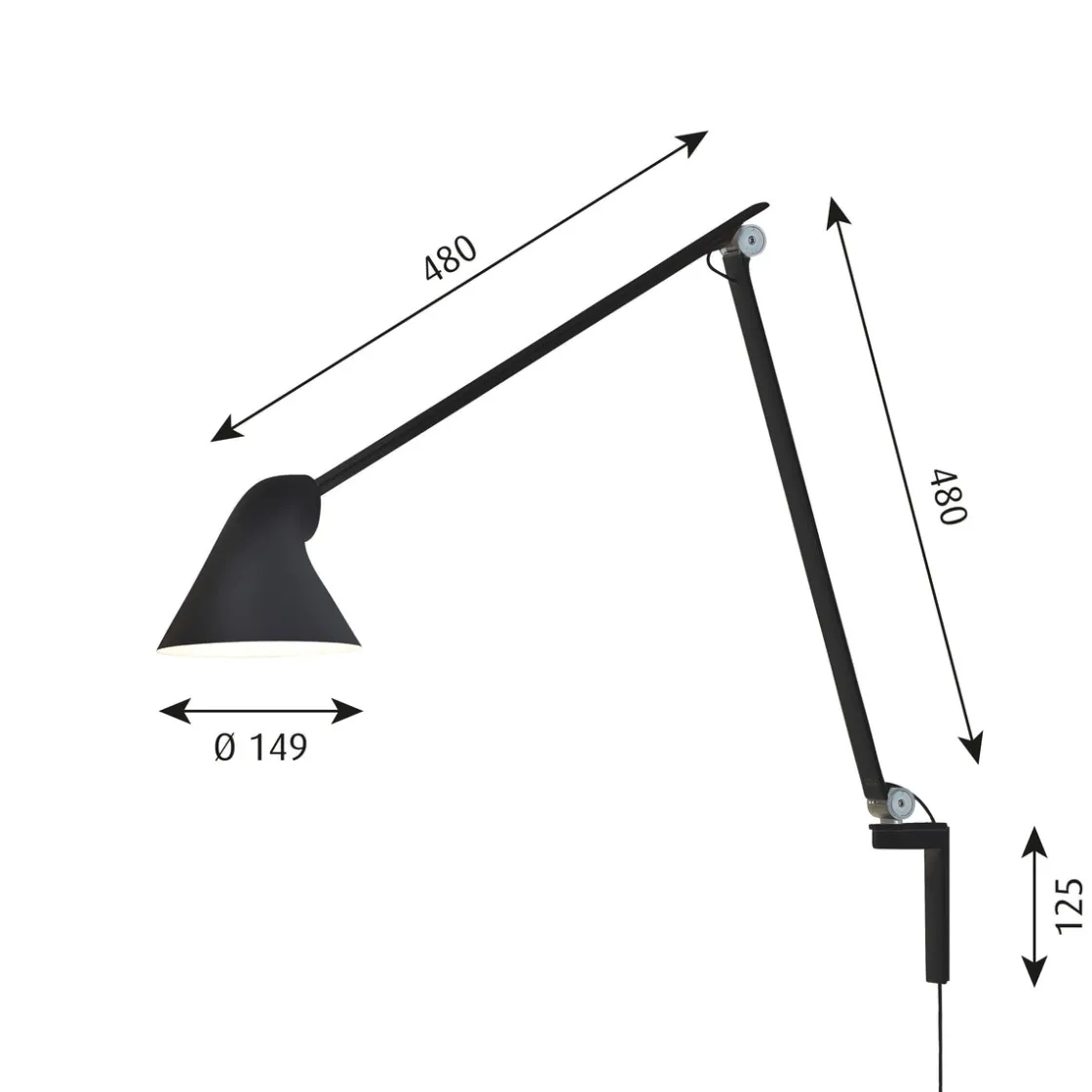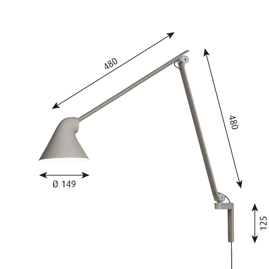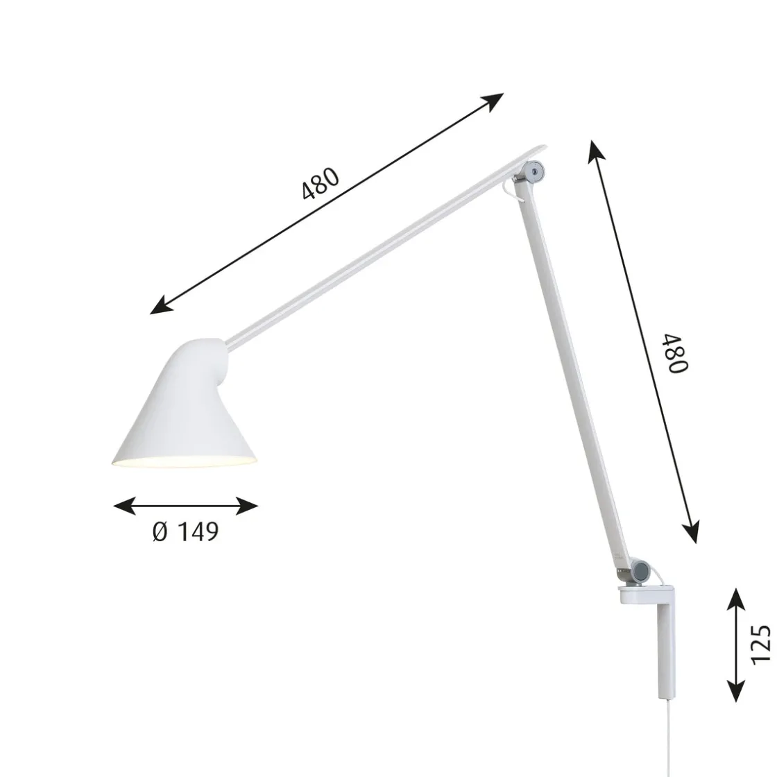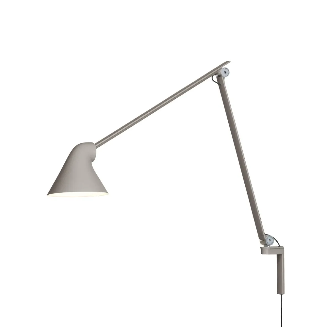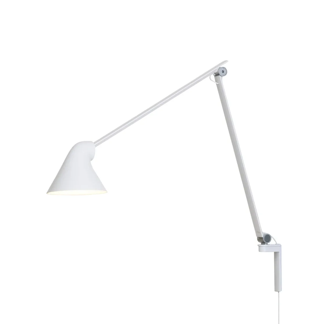 Louis Poulsen NJP vegglampe gir direkte, blendefritt, horisontalt lys og reflekterer samtidig noe av lyset gjennom baksiden av hodet slik at øvre del av armen lyses opp. Armaturhodets ergonomiske design former lyset og sørger for en optimal lysretning. Et enkelt mekanisk system gir stor bevegelsesfrihet, slik at lyset alltid kan stilles inn på det perfekte stedet. Skjermen er malt hvit på innsiden og reflekterer behagelig, diffust lys.