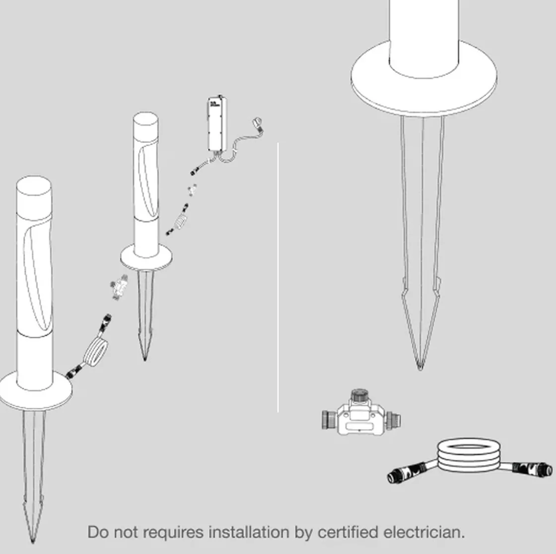 Info: Pullerten er koblet til adapteren ved hjelp av standardstøpsler som leveres med armaturen. Adapteren er plassert eksternt fra pullerten og kan drive opptil seks pullerter. Maksimal avstand til siste pullert er 30 m.