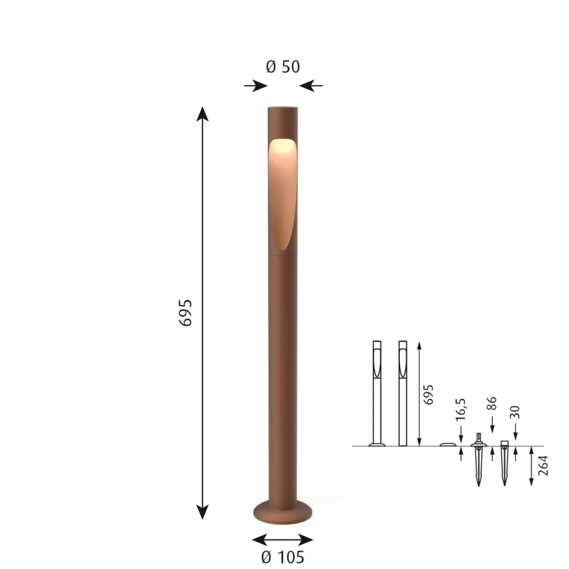 Armaturen avgir et bredt, nedadrettet blendefritt lys. Lyskilden hviler på toppen inne i den asymmetriske utskjæringen på siden av pullerten, hvor gradienten fungerer som en reflektor som mykner lyset og danner en behagelig organisk form på bakken nedenfor.