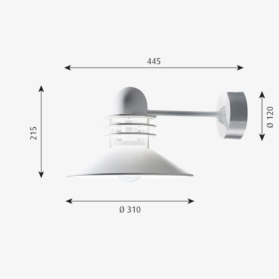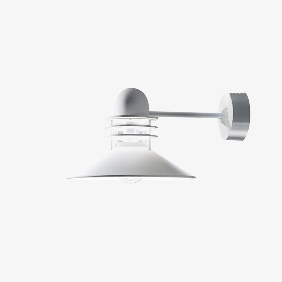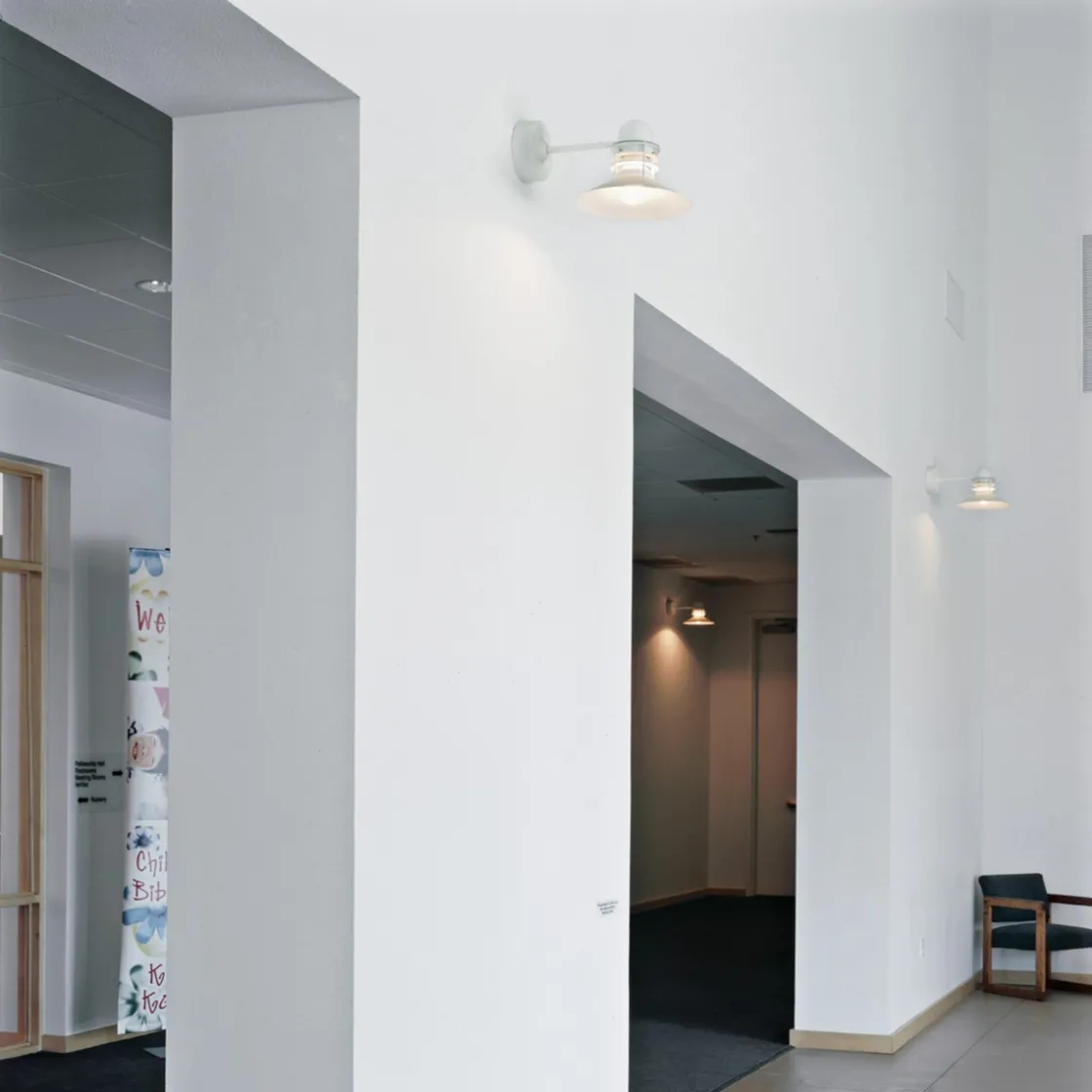 Den kjegleformede skjermen gir et komfortabelt lys som er rettet nedover i en bred stråle. Innsiden på skjermen har en hvit, matt malt overflate som gir en belysning med lav luminans. Ringene fastholder lyset og styrer en liten del av det opp på oversiden av skjermen.