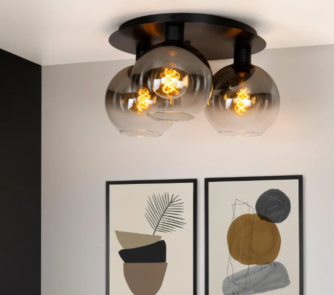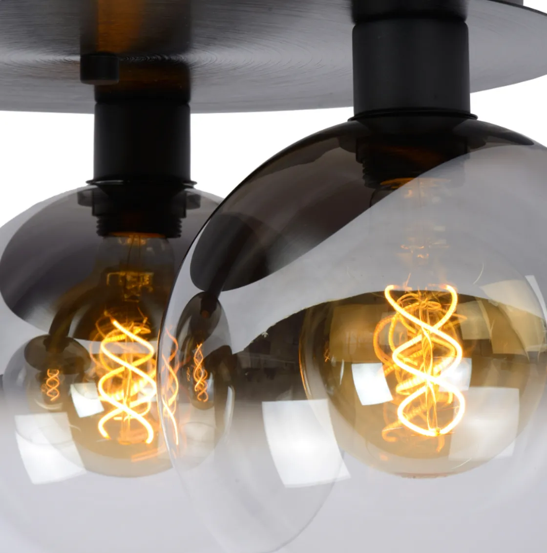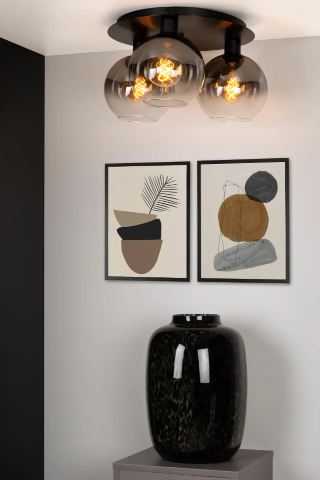 Stilfull taklampe med 3 glasskupler i røykfarge, som kan dimmes ved bruk av dimbare lyspærer og ekstern dimmer.