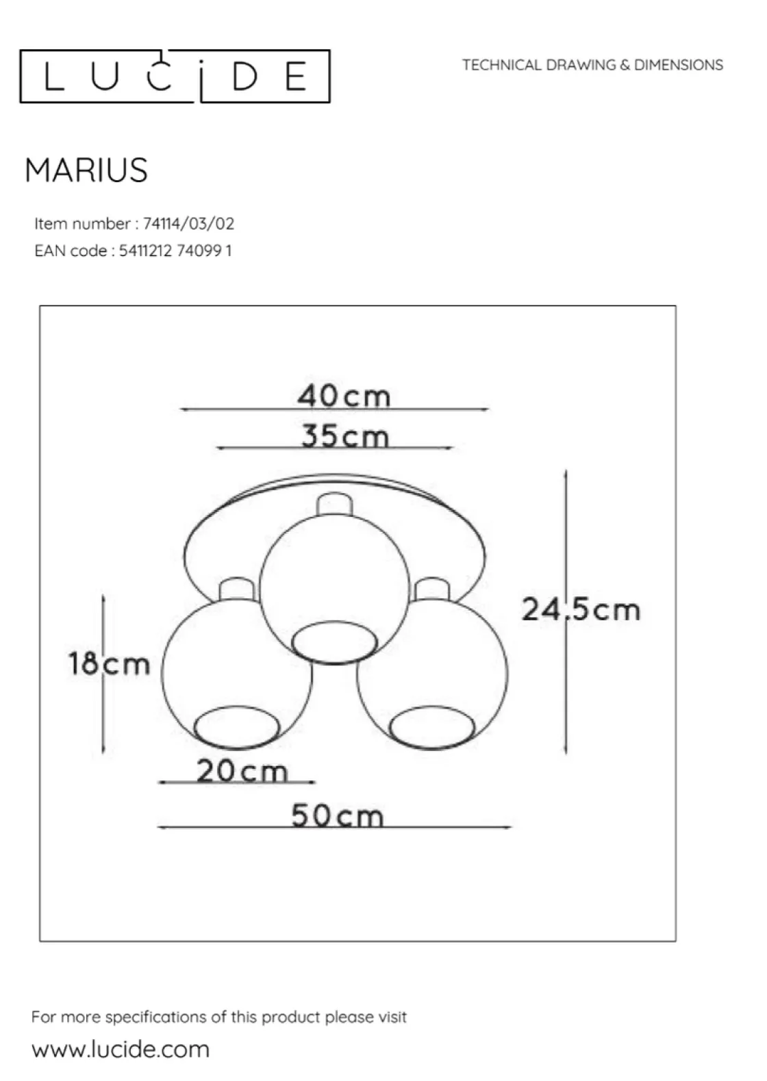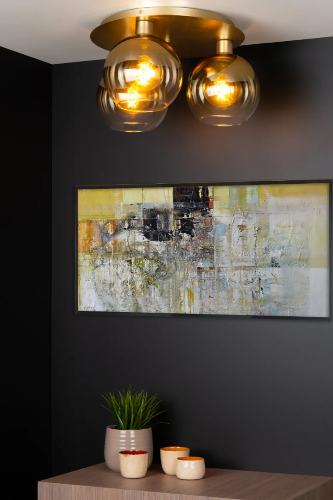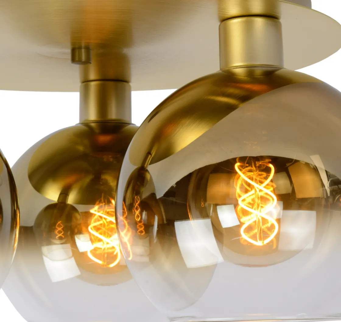 Stilfull taklampe med 3 glasskupler i røykfarge, som kan dimmes ved bruk av dimbare lyspærer og ekstern dimmer.