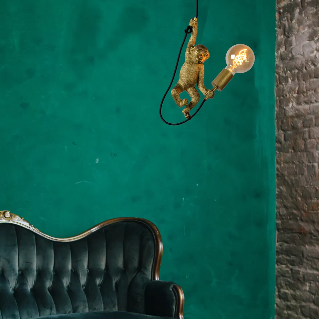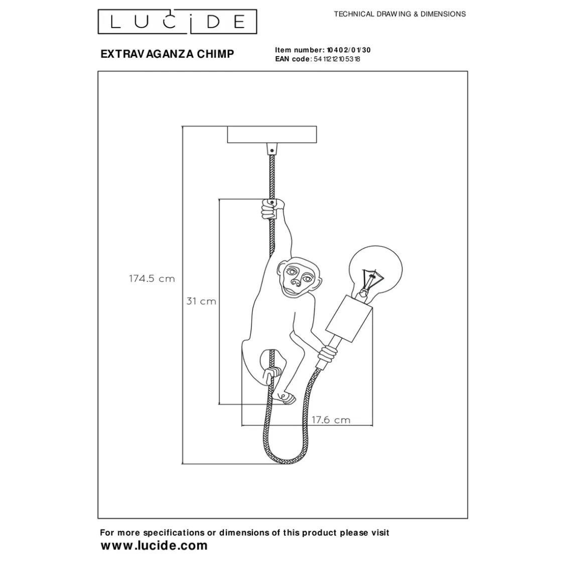 Nydelig lampeserien med retro utseende. Her er det sjimpansen som er i hovedrollen. Plastfiguren dingler på tekstilledningen. Som en dyktig akrobat holder han fast med den ene hånden. Lampen kan justeres i høyden, fra 50 til 174,5 centimeter. Du kan enkelt koble lampen til en dimmer, men da er det viktig at du bruker en lyspære som kan dimmes.
