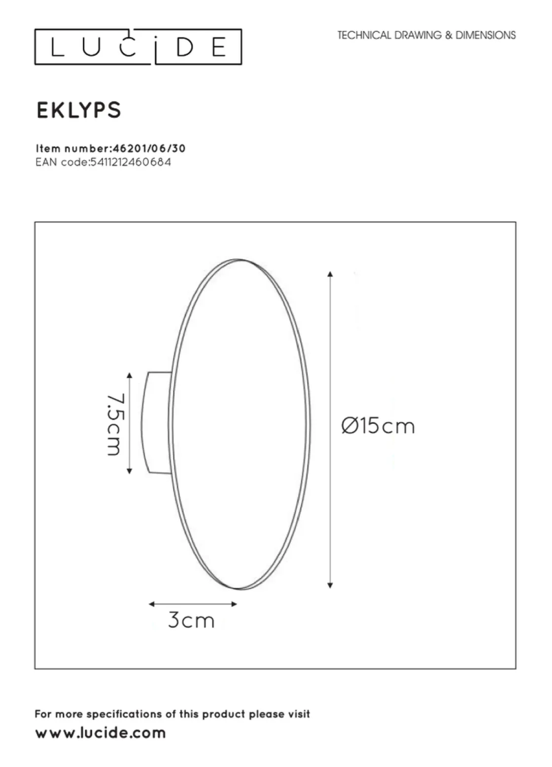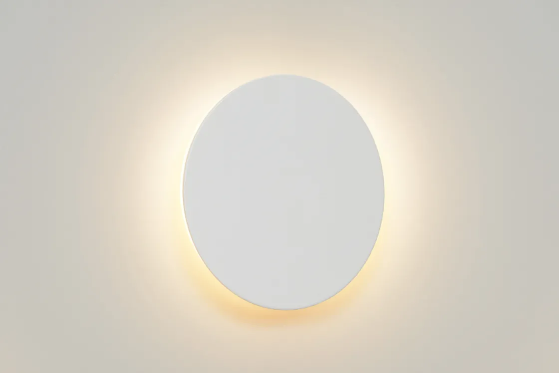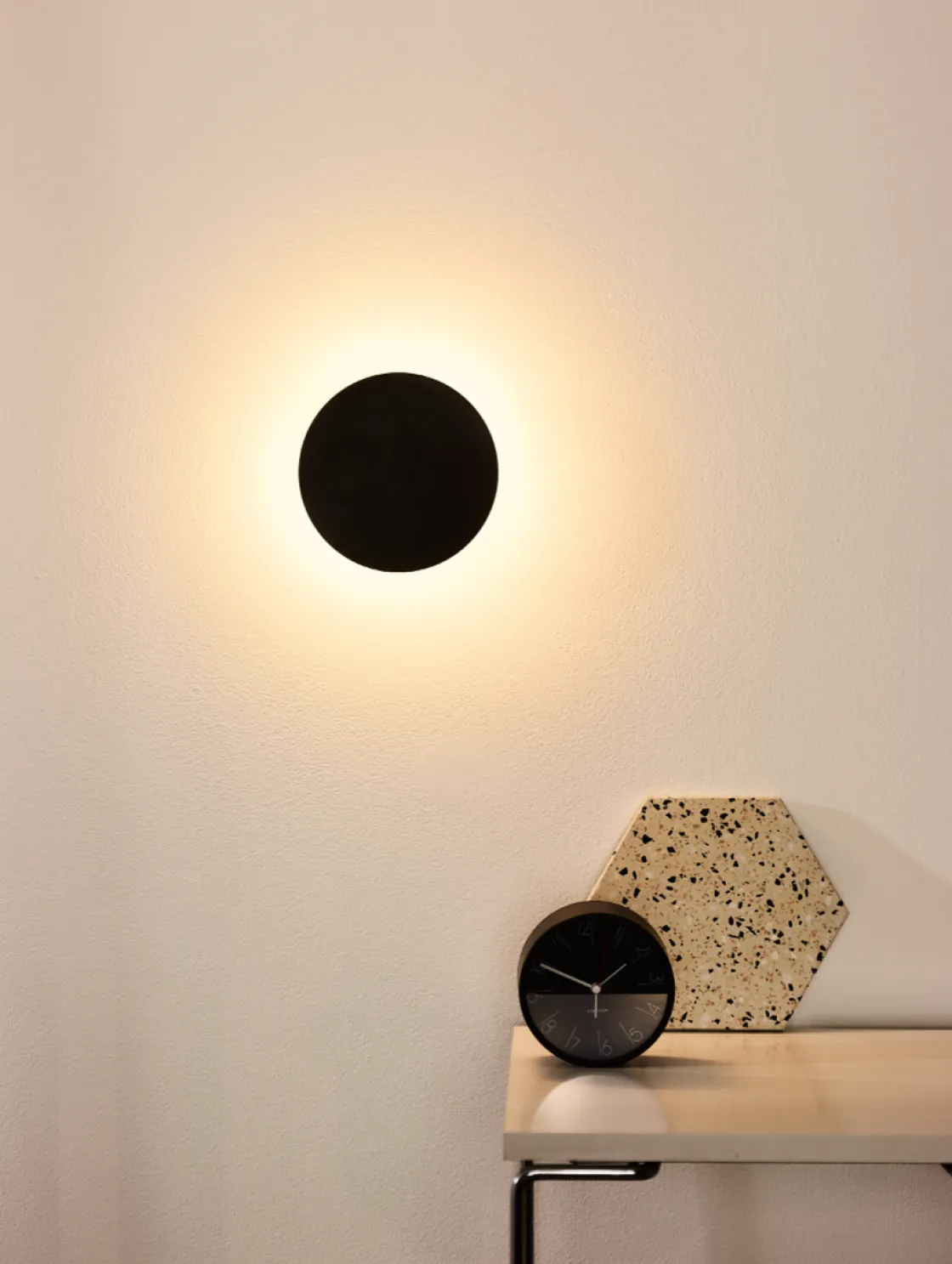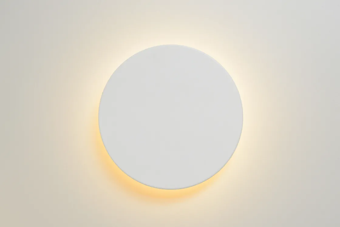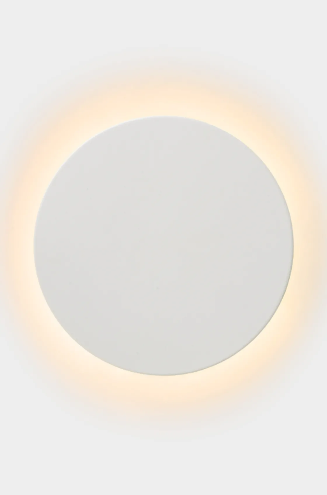 Et koselig varmt lys i taket eller på veggen. Belysningen er skjult bak en elegant metallskive. Når lyset er slått på, endres platen til en diffus glød som skaper varm belysning. Vegglampens aluminiumsokkel kan enkelt festes til veggen. Eklyps passer perfekt i moderne interiør og i stort sett alle rom.