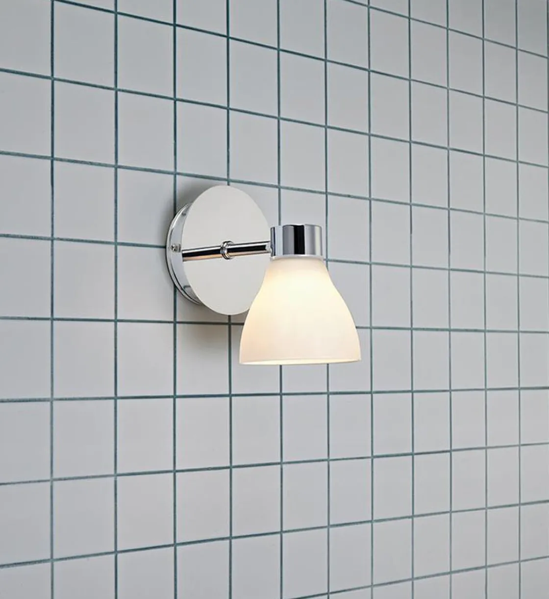 Casis-vegglampe i krom er egnet til bruk på baderom. Den opalhvite kuppelen gir et jevnt og behagelig lys. Lampen kan dimmes ved bruk av dimbare lyspærer og ekstern dimmer.