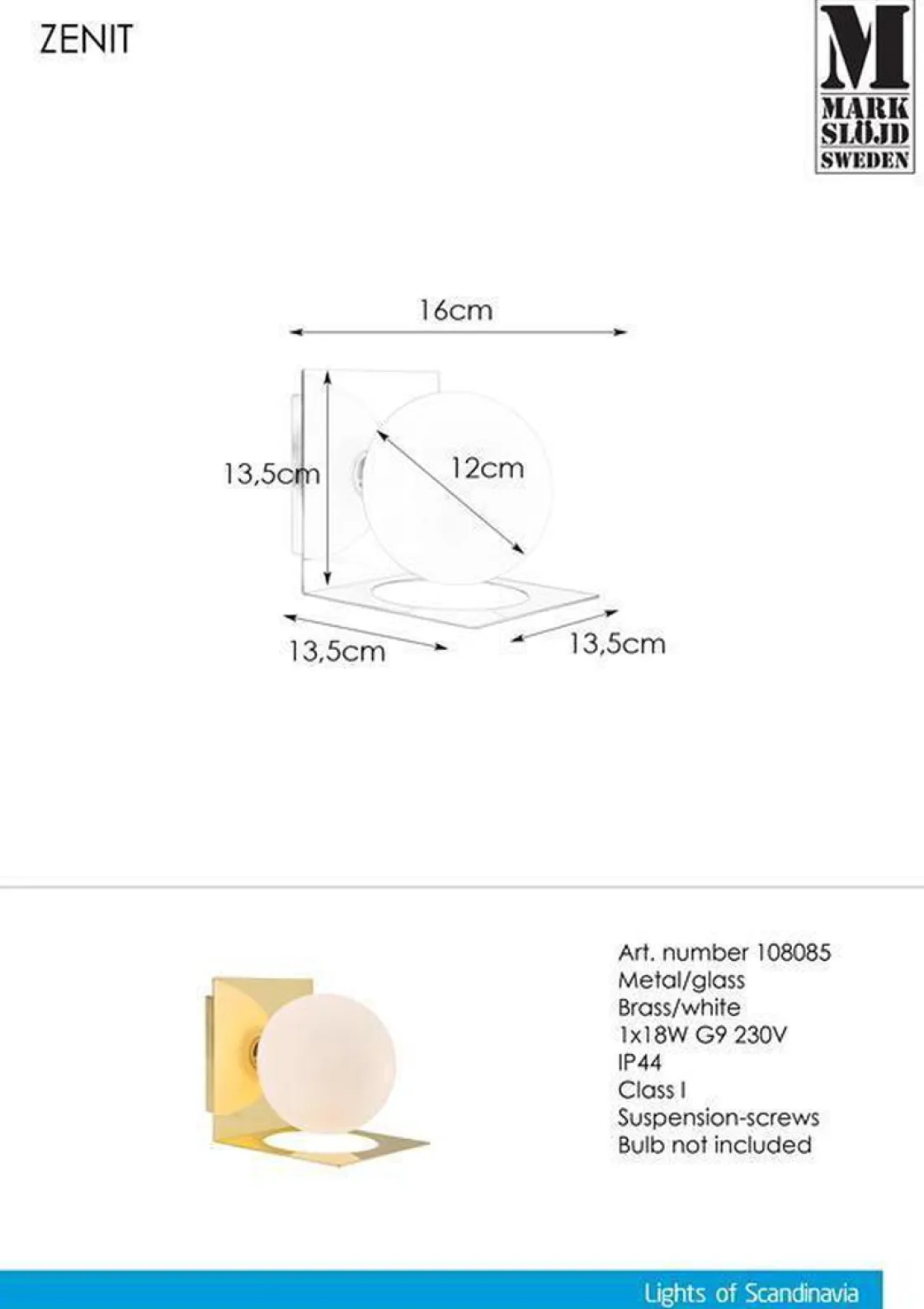 Stilig vegglampe med veggfeste i messingfarge og glasskuppel i opalhvit. Den opalhvite kuppelen gir et jevnt og behagelig lys.