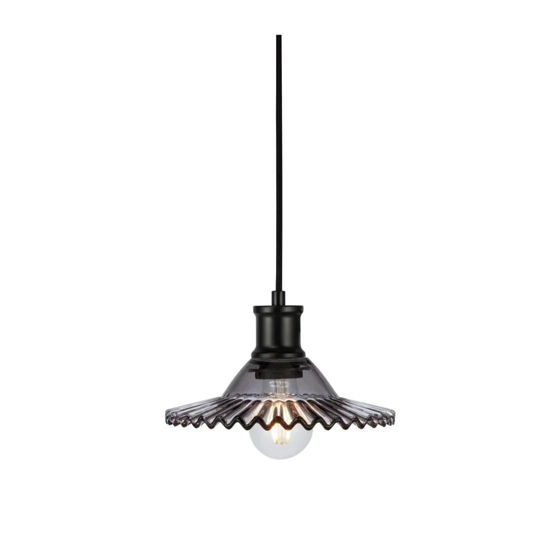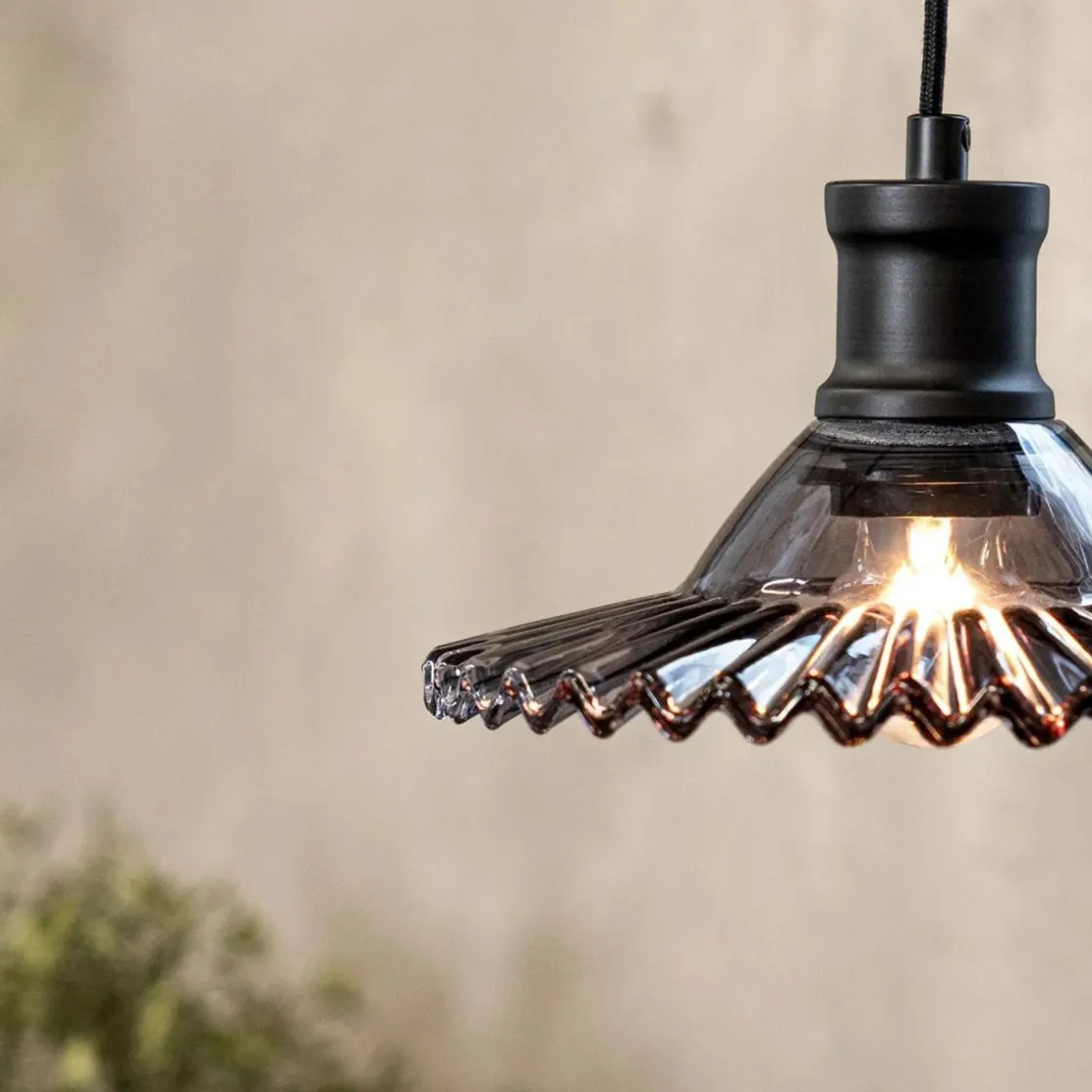 Vinduspendel i gråfarget, røykfarget glass, der lyskilden er synlig under den foldede glasskjermen.