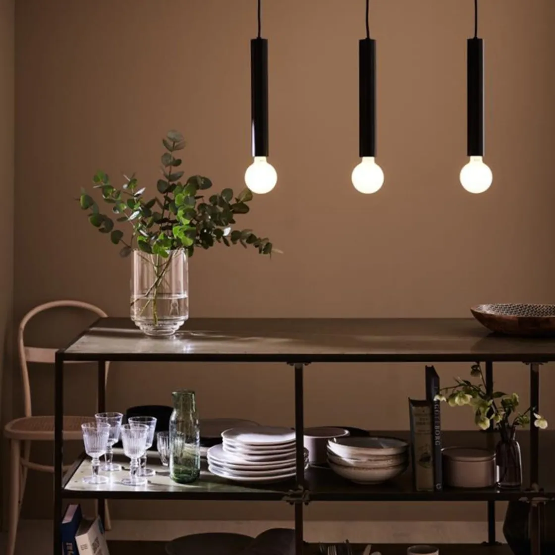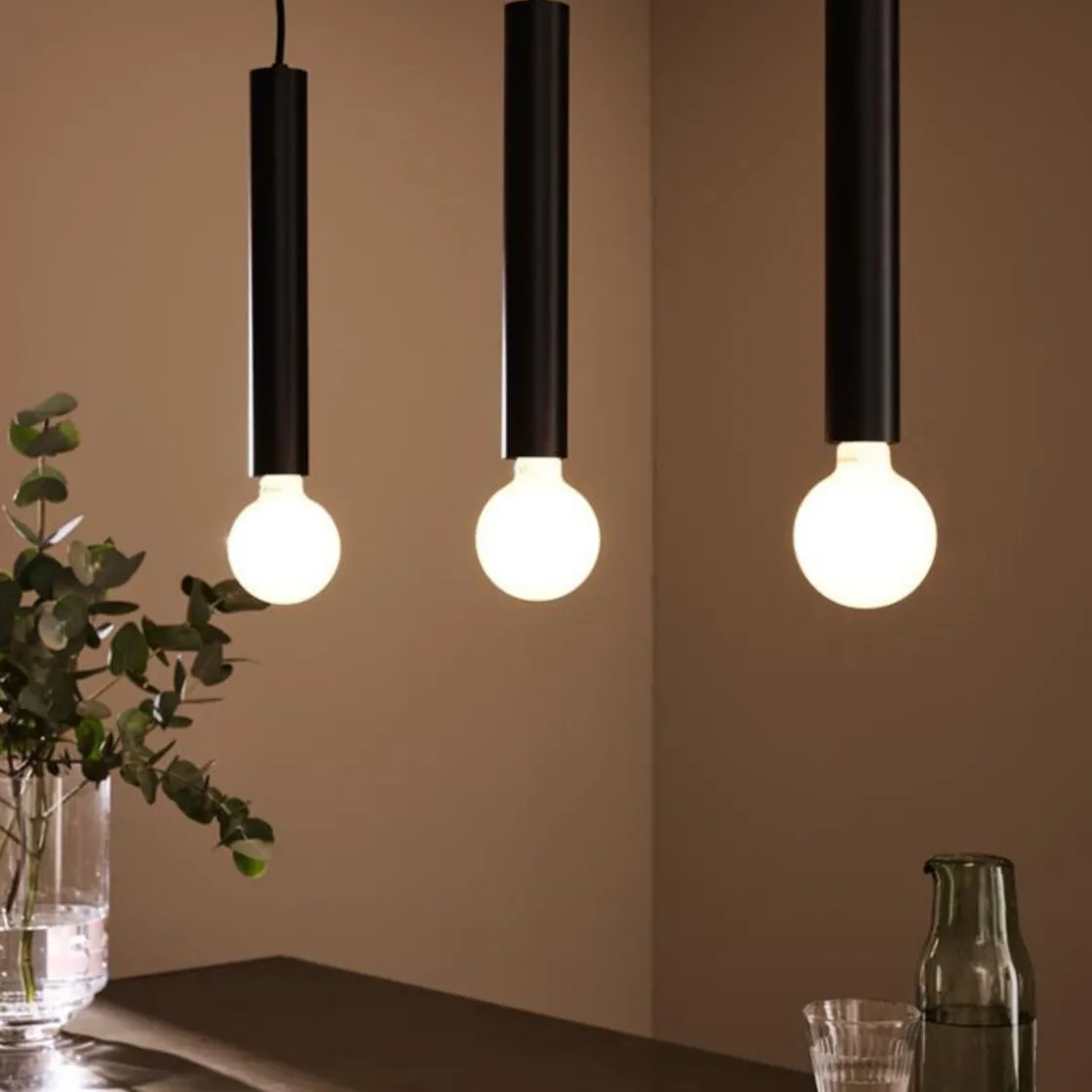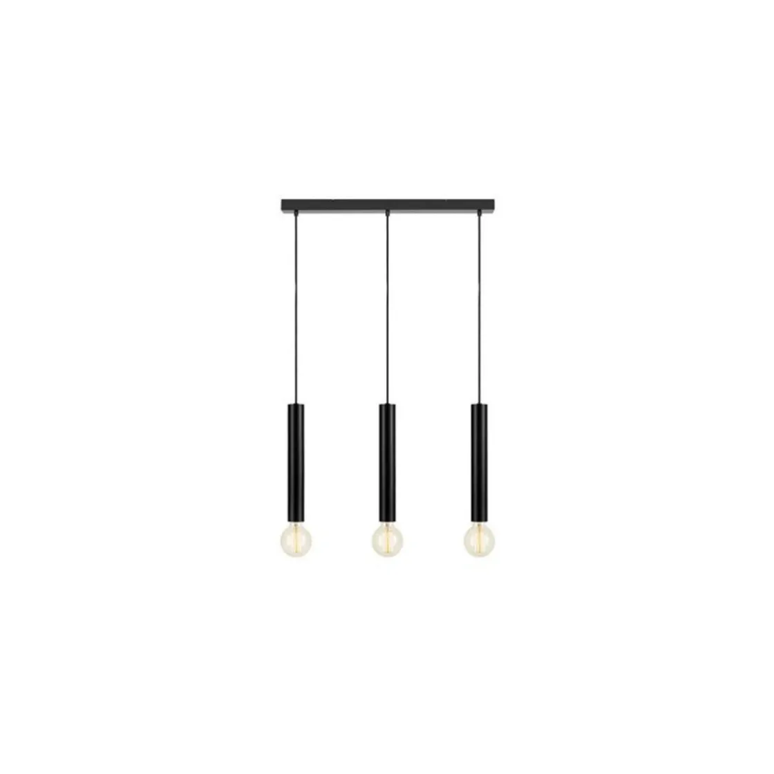 Den har tre sylinderformede skjerme i svart farge, lyspærene er ikke inkludert slik at du står fritt til å velge de pærene du ønsker.
